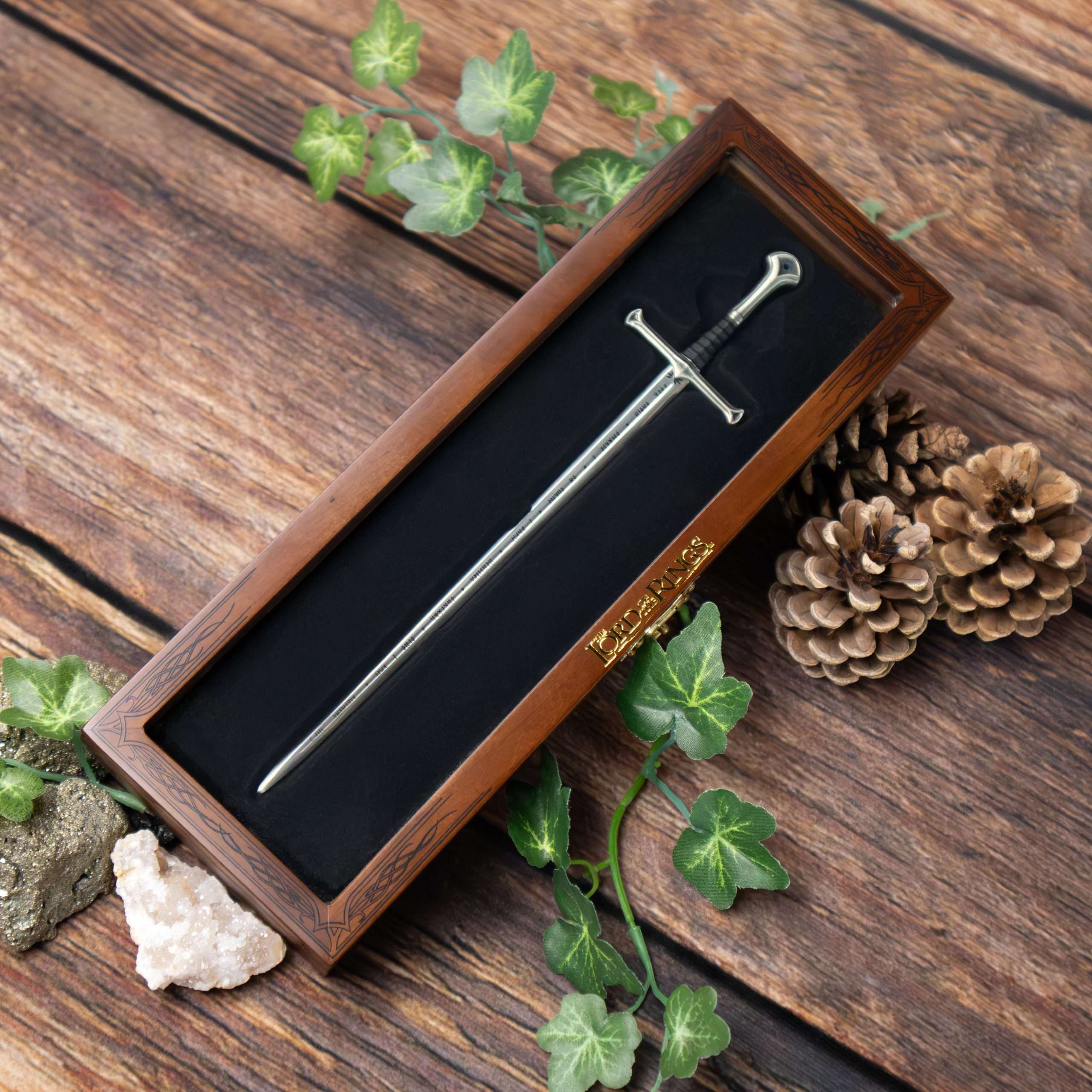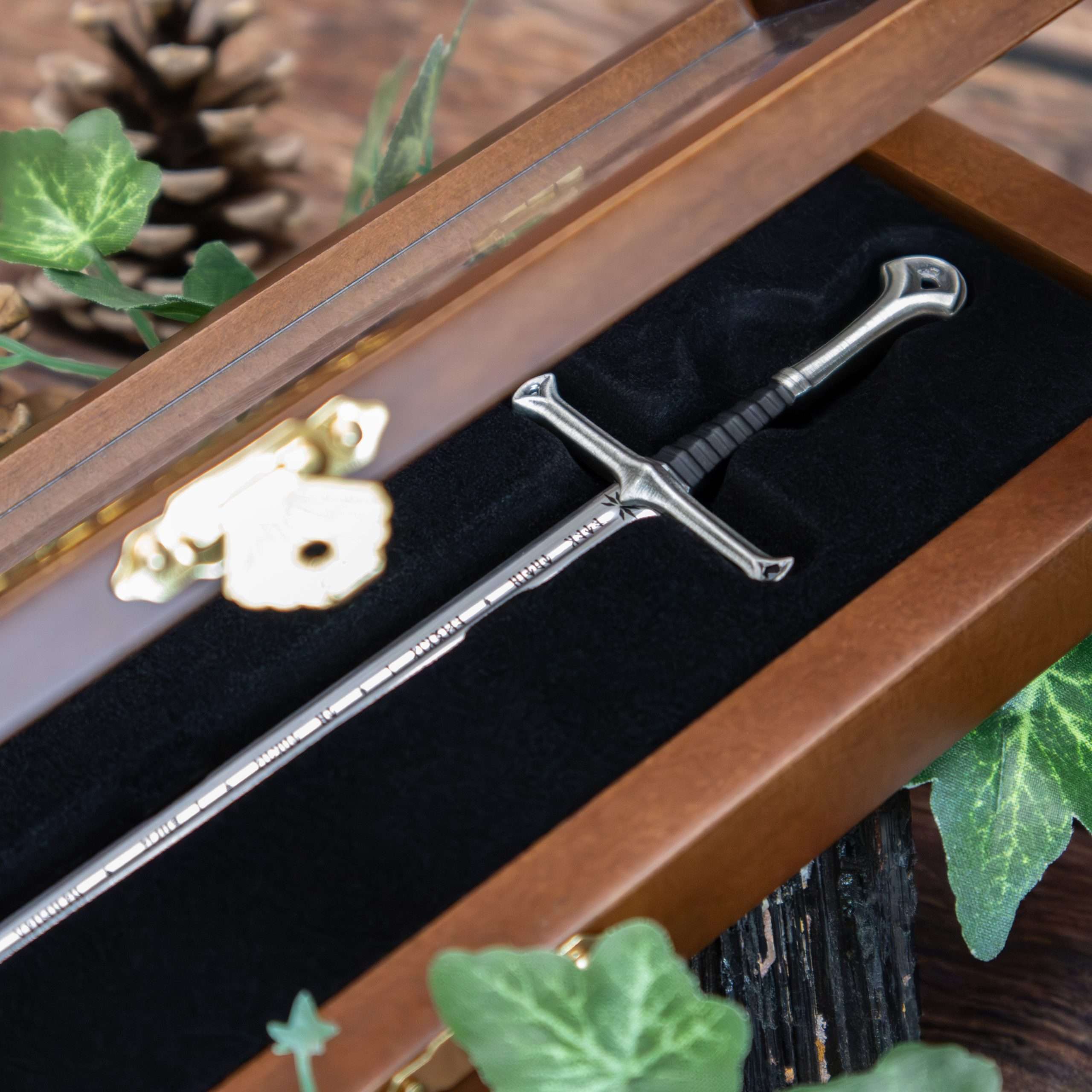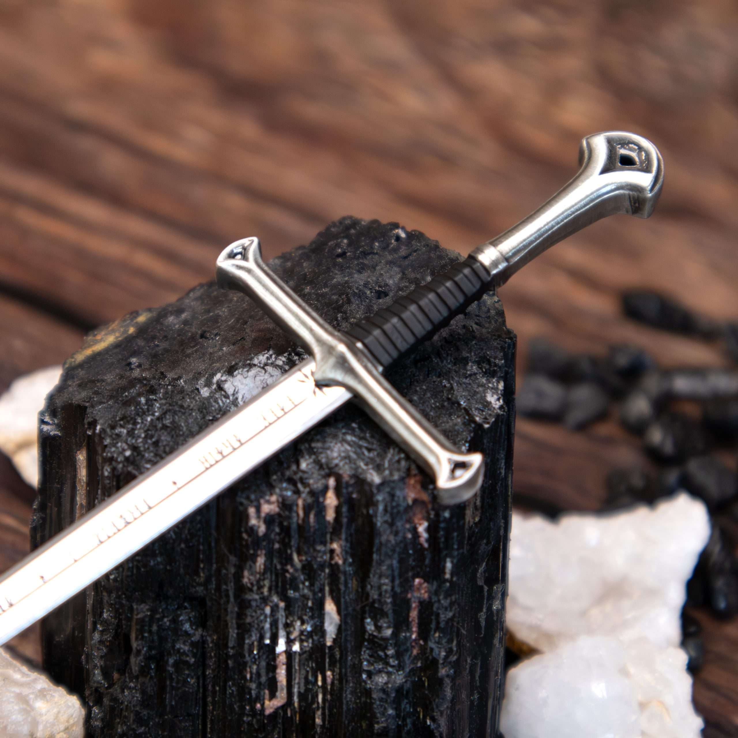 The Flame of the West, forged from the shards of Narsil and wielded by Aragorn, is recreated in miniature as a letter opener measuring approximately 9″ in length.