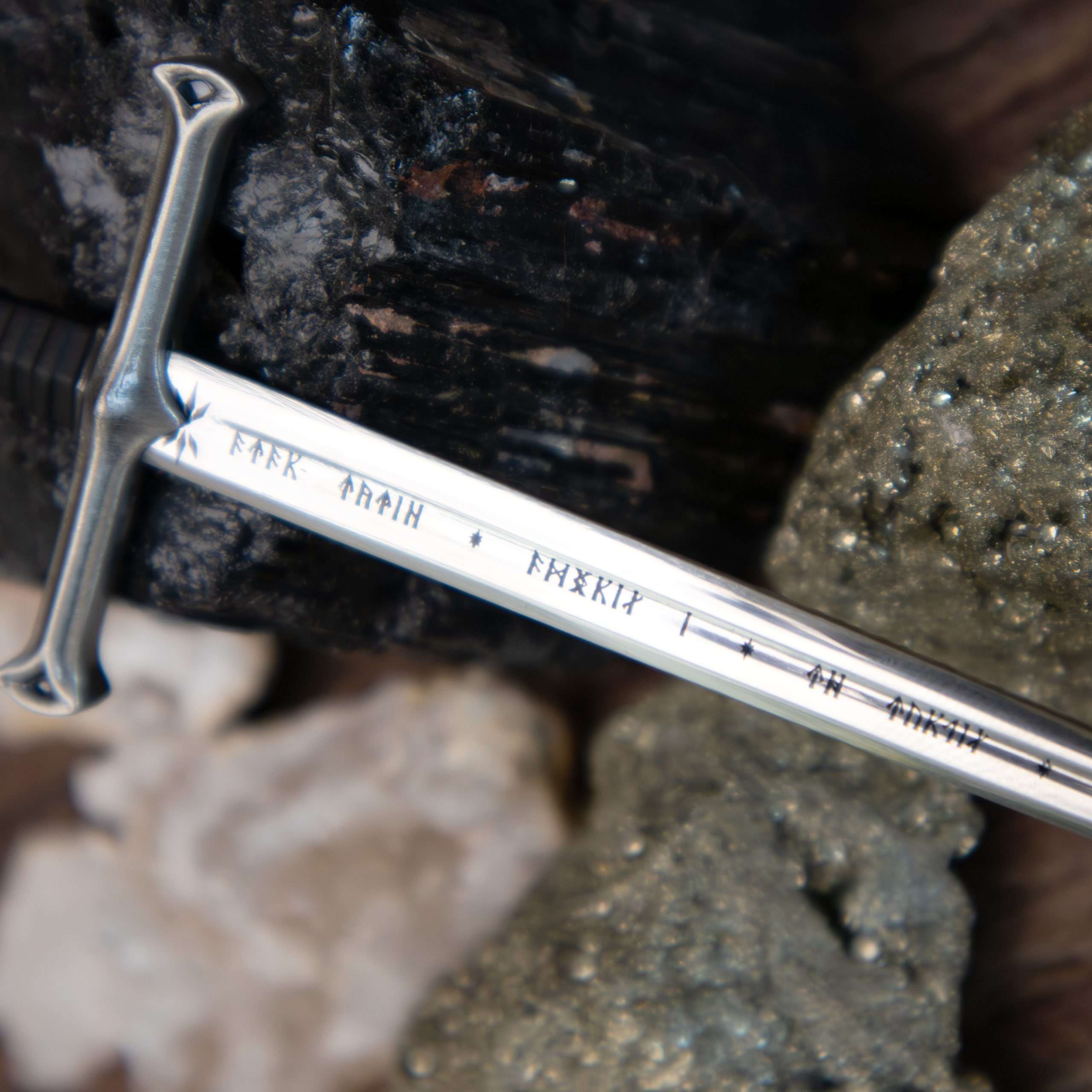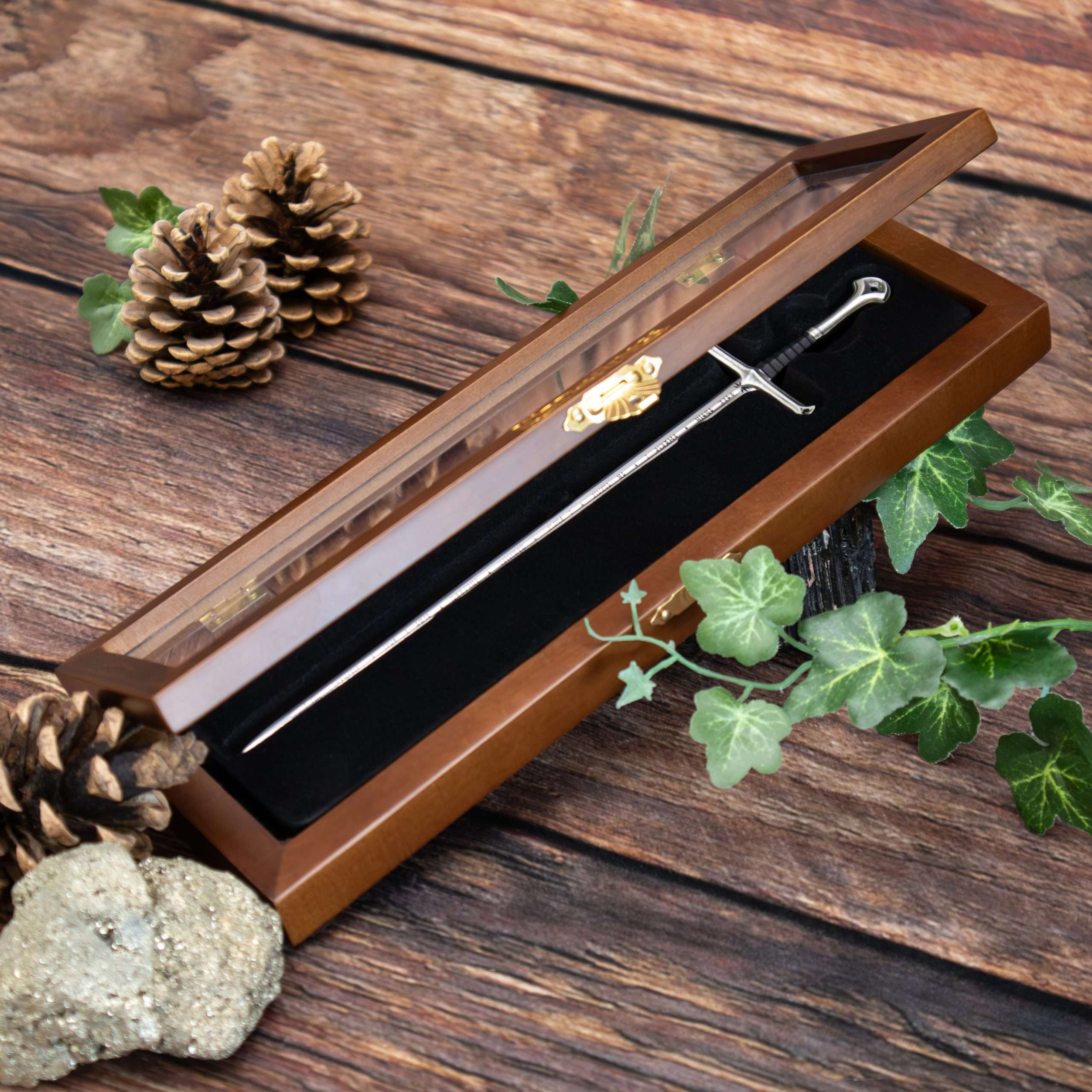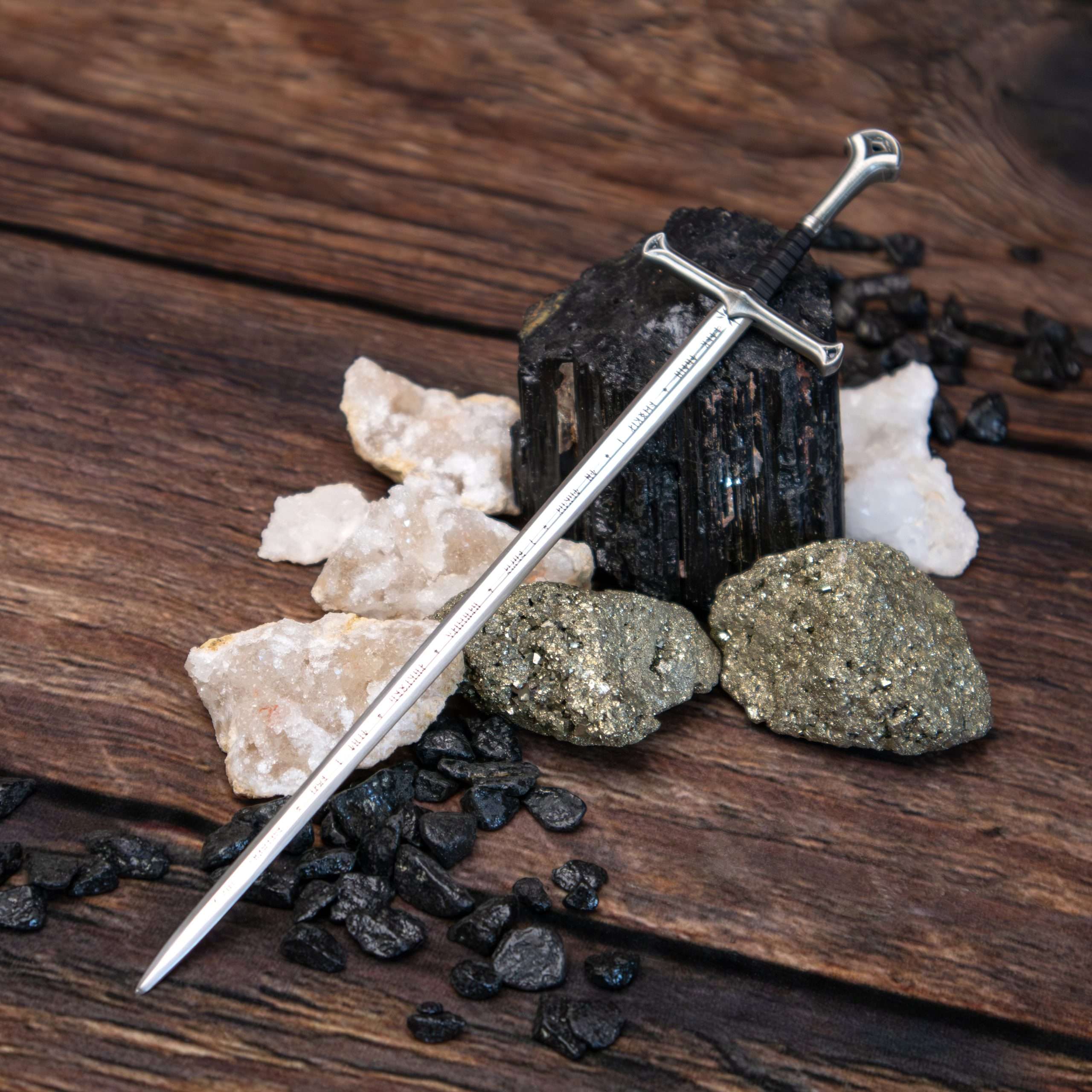 The Flame of the West, forged from the shards of Narsil and wielded by Aragorn, is recreated in miniature as a letter opener measuring approximately 9″ in length.