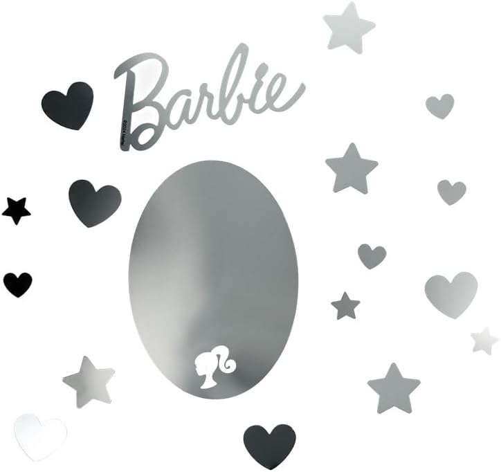 Bring the magic of Barbie into your child’s room with these mirror decals, featuring the iconic Barbie logo. Includes 50 fun-shaped mirror decals, like hearts and stars, to add sparkle and imagination to any space. Official Barbie merchandise from Mattel