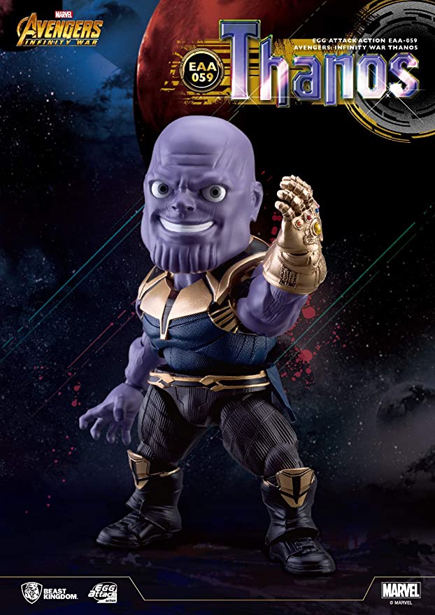 Avengers: Infinity War 8-inch tall Thanos action figure, 27 points of articulations, Thanos head sculpture with a serious visage, Thanos head sculpture with a smiling visage, 1 hand with the Infinity Gauntlet – fisted, 1 hand with the Infinity Gauntlet – relaxed andExclusive stand