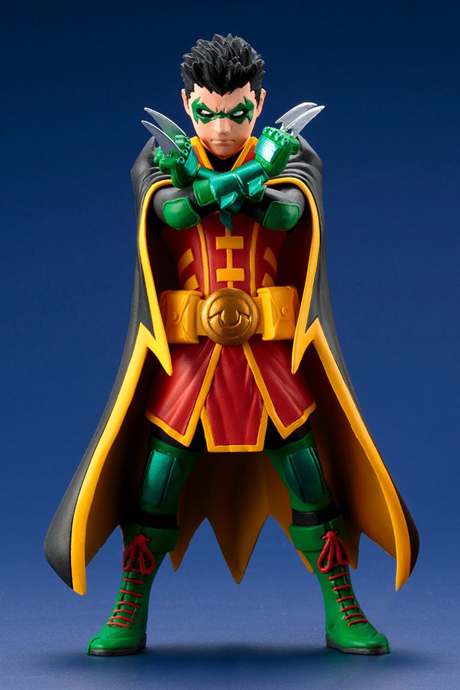 The expansive DC Comics ARTFX+ collection from Kotobukiya returns for its next installment to the exciting Super Sons monthly comic book series starring the children of Superman and Batman in their own heroic adventures. While Jonathan Kent and Krypto take to the skies, the shadows are the domain of ROBIN AND ACE THE BAT-HOUND! A boy with a complicated home life, Damian Wayne is the son of Bruce Wayne and Talia al Ghul. His father only learned of his existence after Damian spent a number of years training with the League of Assassins, and Damian can be even more cold and detached than Batman. Robin joins the ARTFX+ Statue series in a small but truly imposing package, standing in a wide-legged stance and holding batarangs at the ready. The fifth Robin’s costume is of course a combination of red, yellow, green, and black like his predecessors, and features combat boots, armored plates, reinforced gloves, a utility belt, and scalloped cape. Damian completes the look with a vicious expression on his face along with a green mask and short, spiky black hair. Robin’s faithful companion is Ace the Bat-Hound, a brown canine of indeterminate breed who’s just as aggressive as his human. The Ace figure crouches with his tail and ears held straight up, head pointed forward, and teeth bared. And he wouldn’t be the Bat-Hound without a black mask! Sculpted by Ikkei Jitsukata, Robin and Ace the Bat-Hound stand just over 5 ½ inches and 3 ½ inches tall (1/10 scale) respectively, with magnets in their feet for perfect stability on the included display bases. Display Robin and his dog by themselves or alongside other ARTFX+ statues like Batman and the other Super Sons 2-Pack of Jonathan Kent and Krypto!