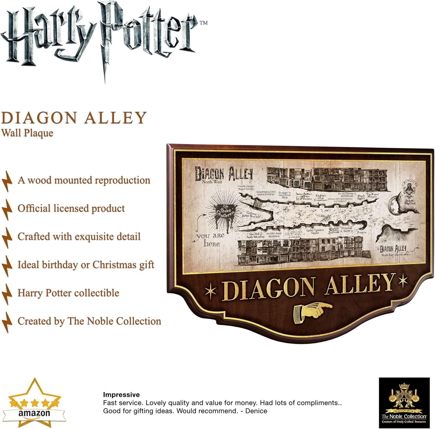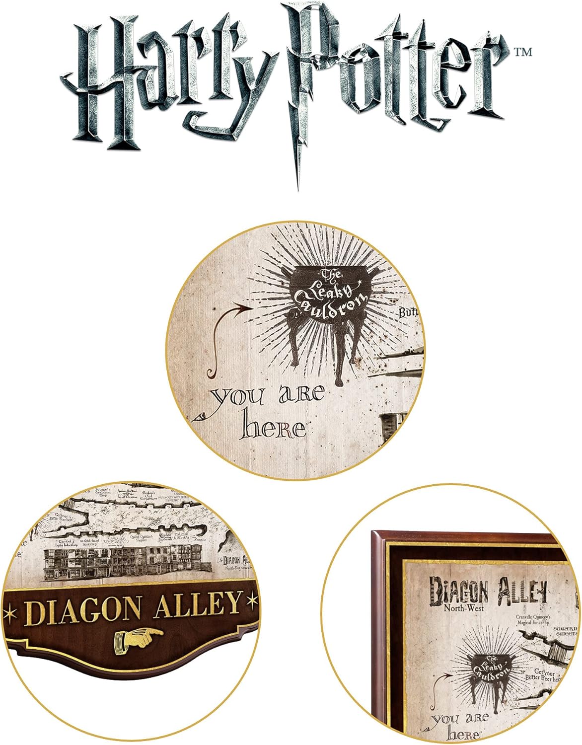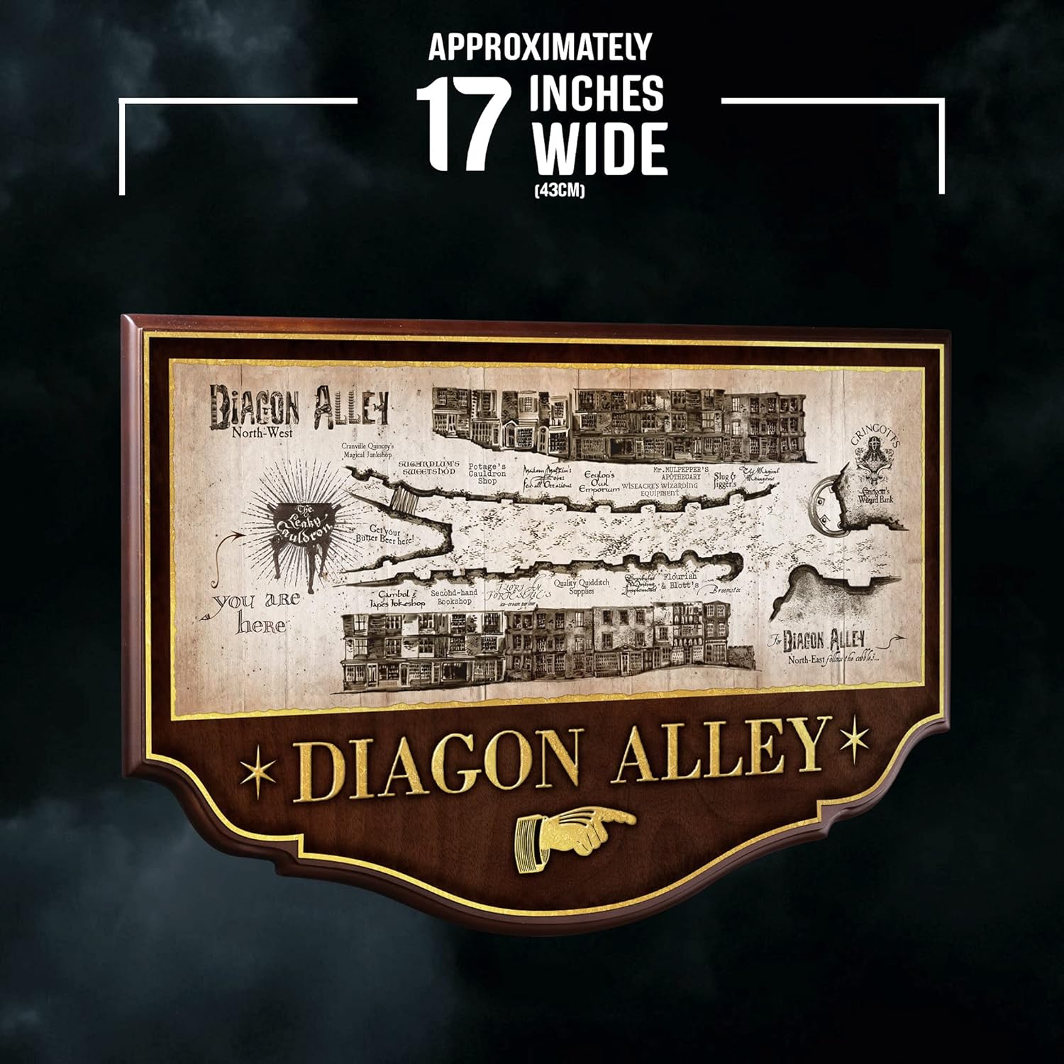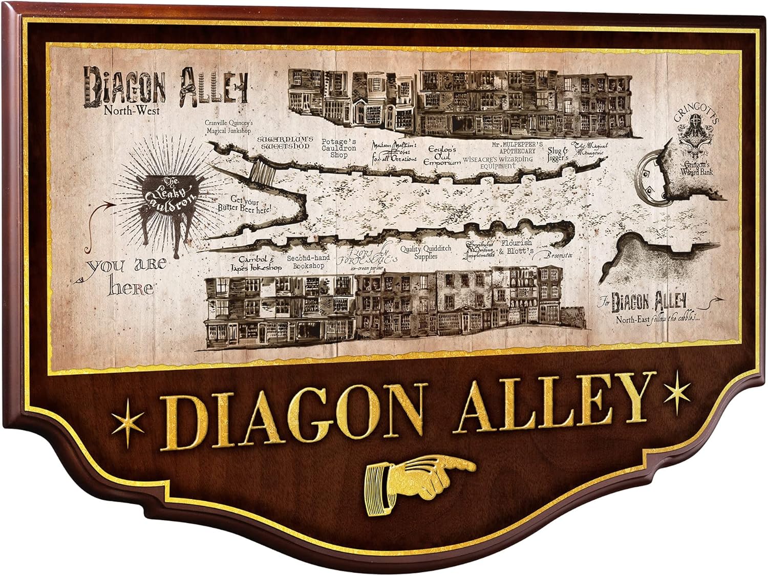 Decorate your home in a magical and typically London atmosphere, get inspired by the famous Diagon Alley. This is the aisle where you find the most famous shops in the wizarding world! The Diagon Alley wall plaque represents a detailed plan of the Magic Street with a faithful representation of the various shops present. Made of wood, we can read on the plate “Diagon Alley”, the English name.