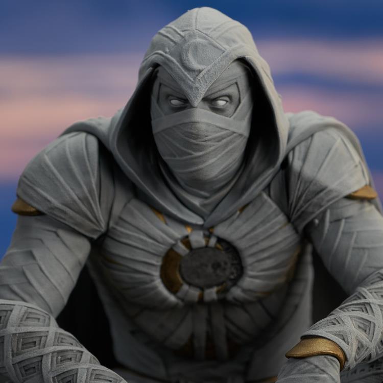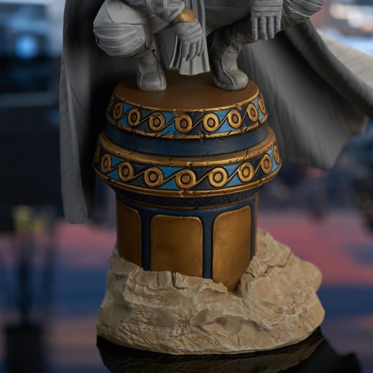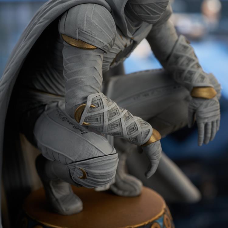 A Diamond Select Toys release! Steven Grant and Marc Spector team up to become the most unusual superhero around – Moon Knight! Based on his appearance in the Disney + Series, Moon Knight crouches on top of an Egyptian column in this approximately 10-inch sculpture. Made of high-quality PVC, it features detailed sculpting and paint applications, and comes packaged in a full-color window box. Designed by the Silva Bros., sculpted by Eduardo Trujillo!