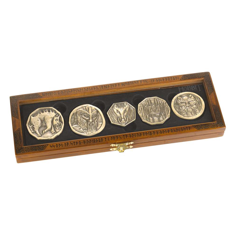 Own a piece of Smaug’s treasure hoard from under the Lonely Mountain with this Dwarven coin set. The set includes 5 detailed, bronze-plated Dwarven coins presented in a wooden display box.
