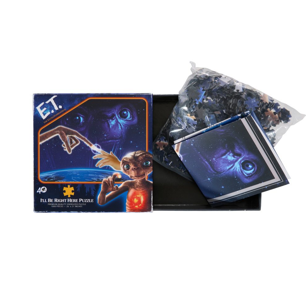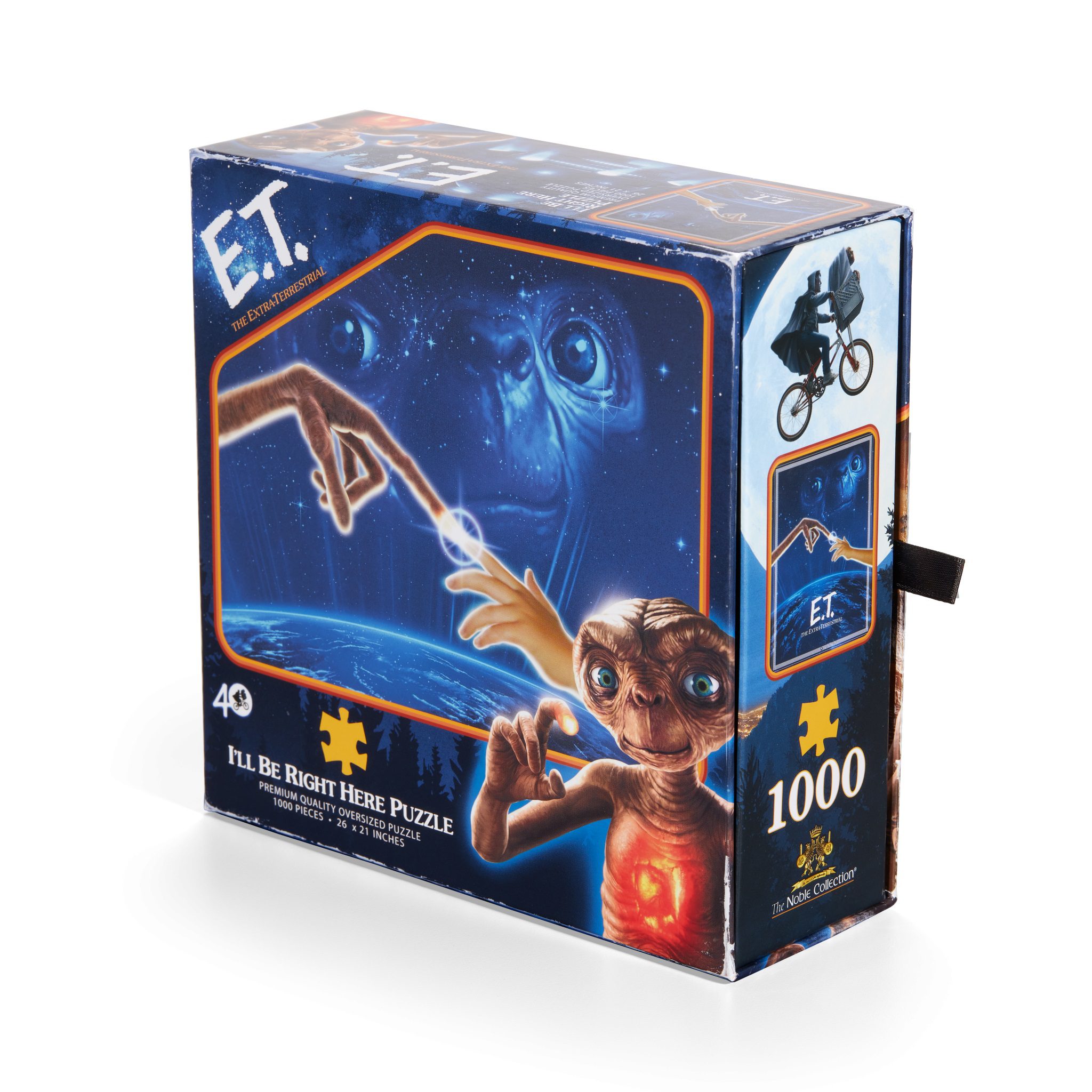 A 1,000 piece jigsaw puzzle inspired by E.T. the Extra Terrestrial (1982), featuring the iconic image of Elliot and ET’s fingers touching, with retro 80s-style detailing including a distressed-style finish on the outer box.