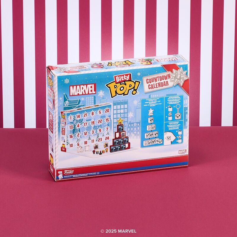 Count down to your favorite festive holiday—or any special occasion—with the Marvel 24-Day Bitty POP! Countdown Calendar! Open the tiny doors to reveal 10 Bitty POP! collectibles, 7 stackable display pieces, 3 holiday accessories, 2 keychain cases, and 2 pin cases. Expand your super hero lineup by making this Marvel 24-Day Bitty POP! Countdown Calendar the next addition to your collection.