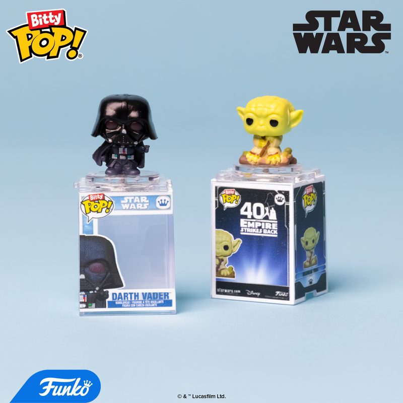 The world of POP! is getting bigger—and smaller—with Bitty POP! collectibles! Expand your Star Wars™ collection with this assortment of Bitty POP! collectibles featuring the most stellar characters in the galaxy! This 4-pack includes Bitty POP! Darth Vader™, Bitty POP! Lando Calrissian™, Bitty POP! Luke Skywalker™ and Yoda™, and a mystery Bitty POP! figure. The possible mystery Bitty POP! collectibles are Hyper Rare (1/6) Han Solo™ in Carbonite, Hyper Rare (1/6) Bossk™, Rare (1/3) Princess Leia™ (Bespin), and Rare (1/3) Han Solo™ (Hoth).