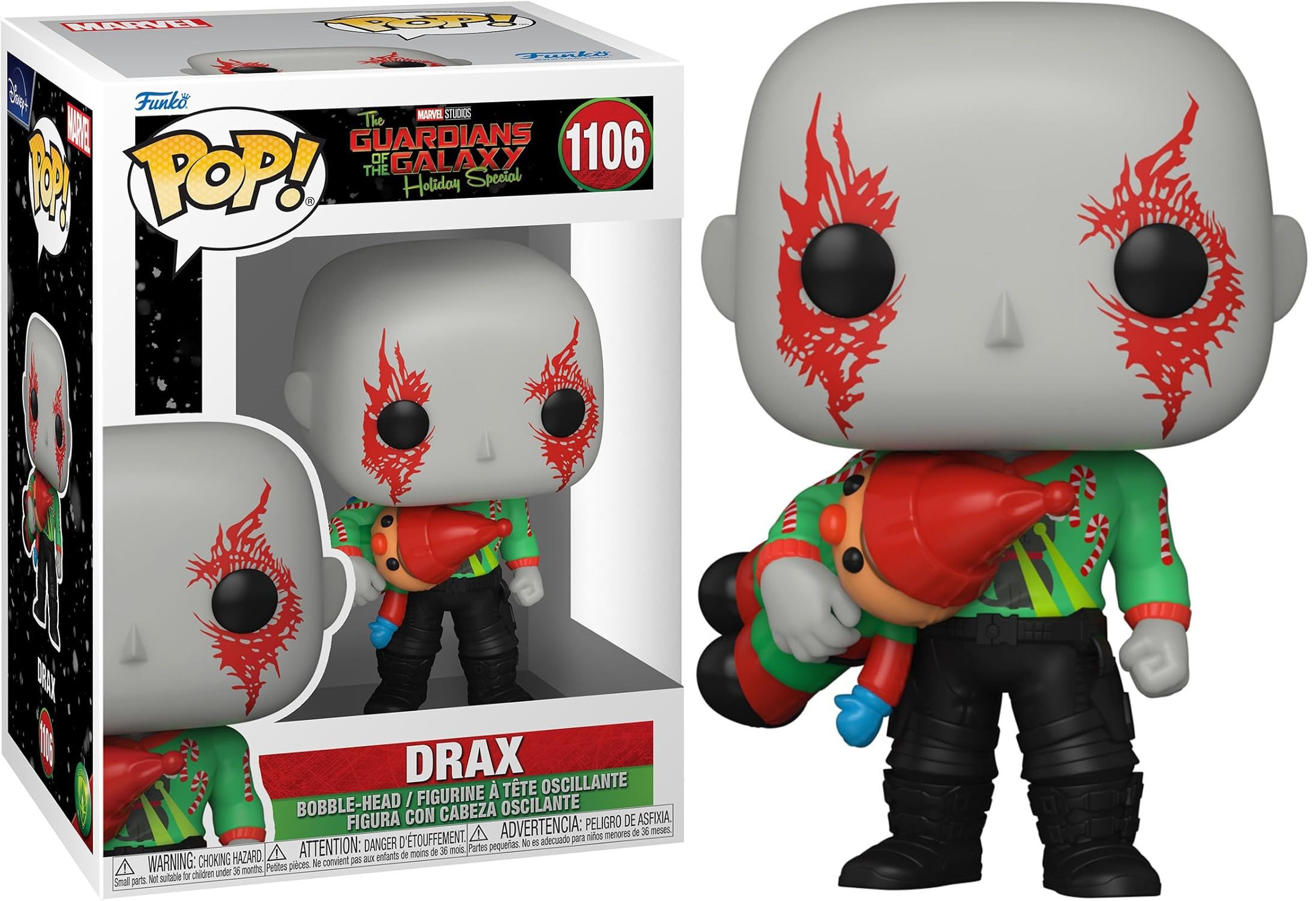 Deck the galaxy this holiday season with Pop! Drax from Marvel Studios’ Guardians of the Galaxy Holiday Special! Pop! Drax, armed with a toy elf, looks ready for festive heroic fun. Join him for action-packed, holiday-themed adventures across the cosmos.