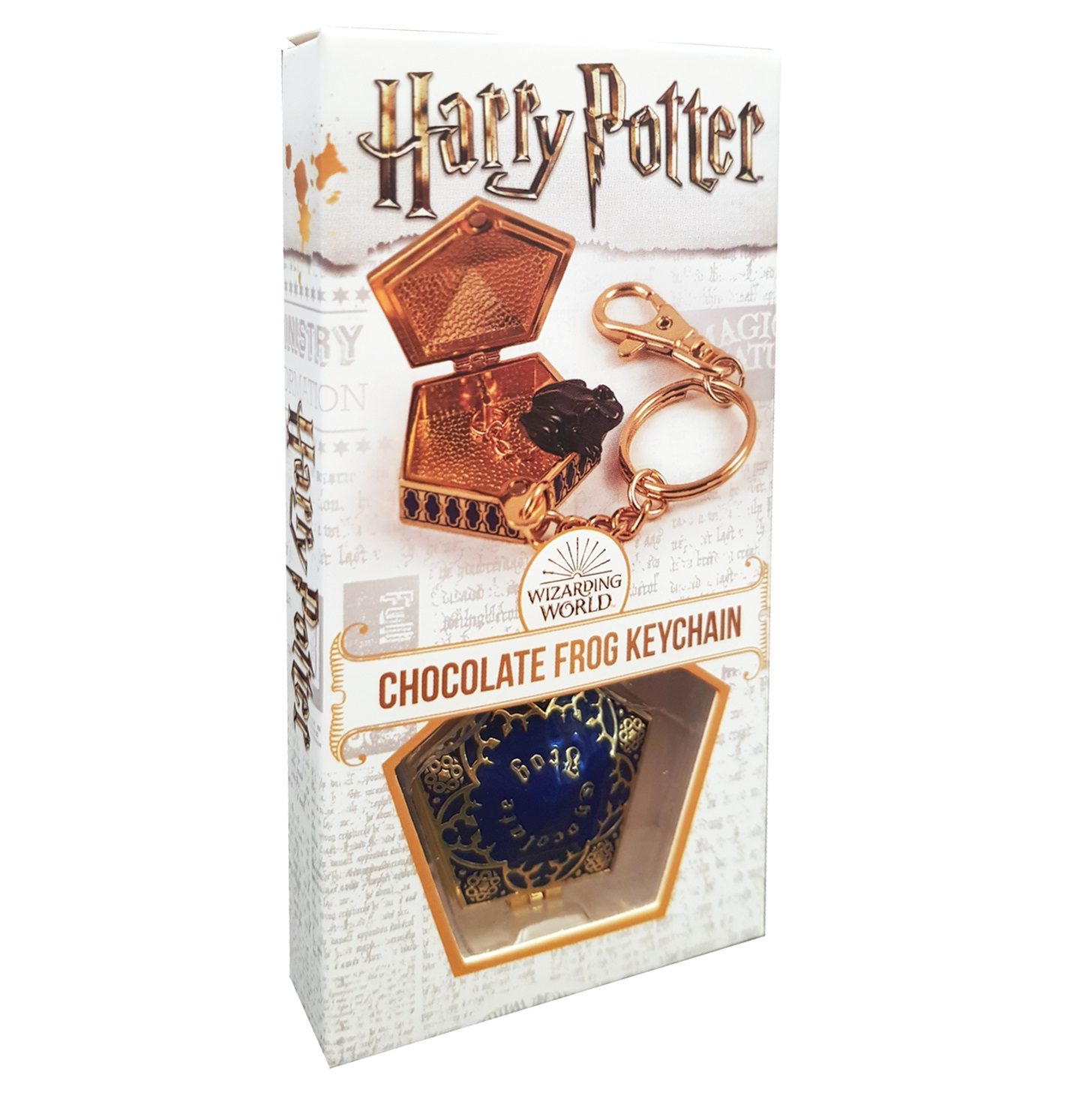 A die cast metal keychain based on the Honeydukes Sweetshop Chocolate Frog. The metal box containing the metal frog measures 1.5″ with frog measuring 0.5″. Comes in a Harry Potter branded card and window box.