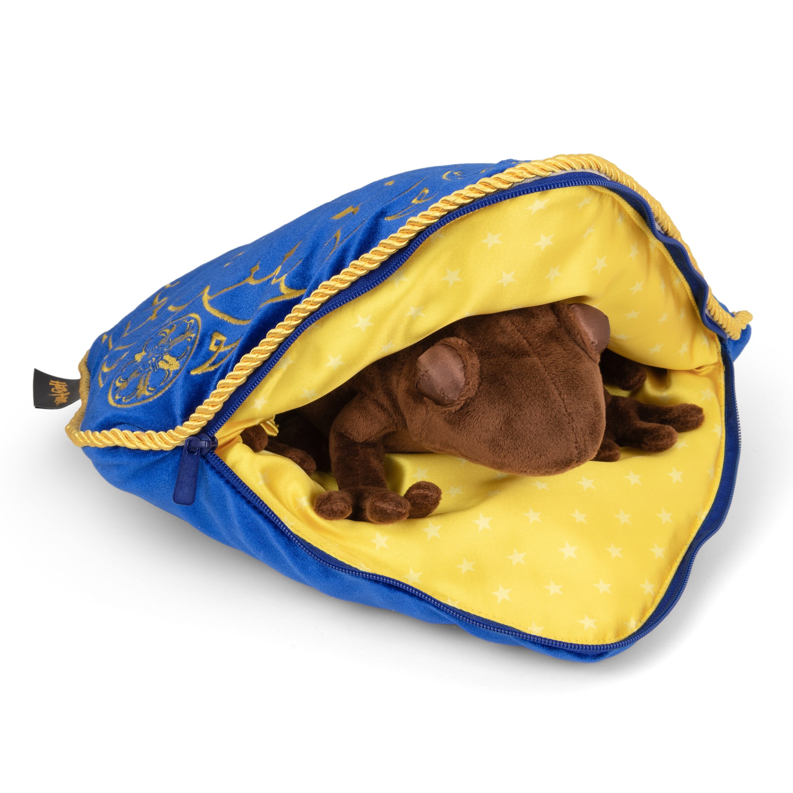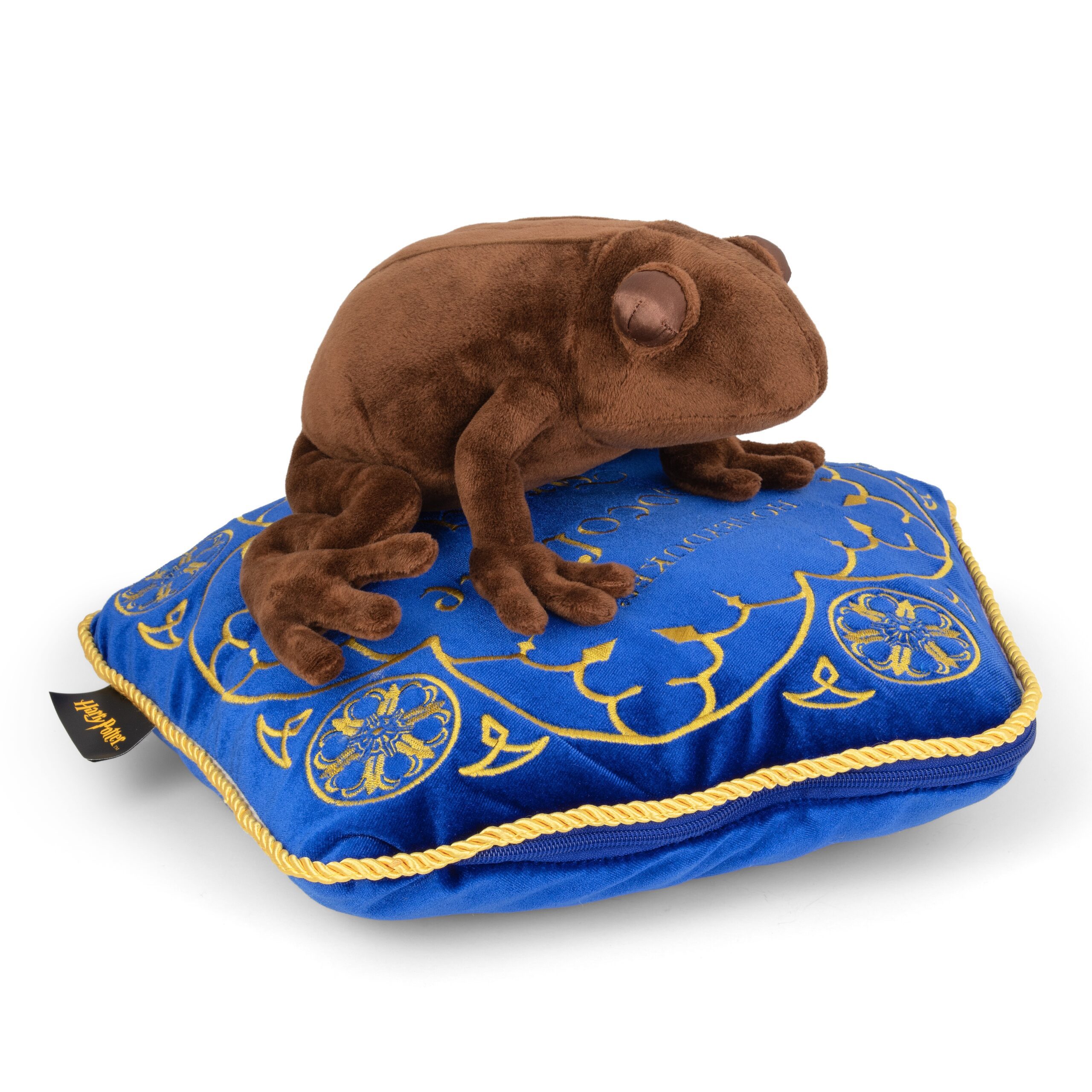 A plush version of Chocolate Frog Prop Replica offered with a Honeydukes Sweetshop branded cushion. The frog can be stored inside the pillow.