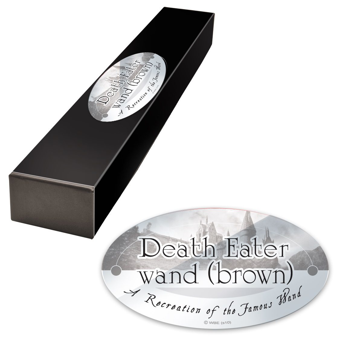 A Death Eater’s wand in a brown design. Character box contains name clip. Wand measures approx 38cm.