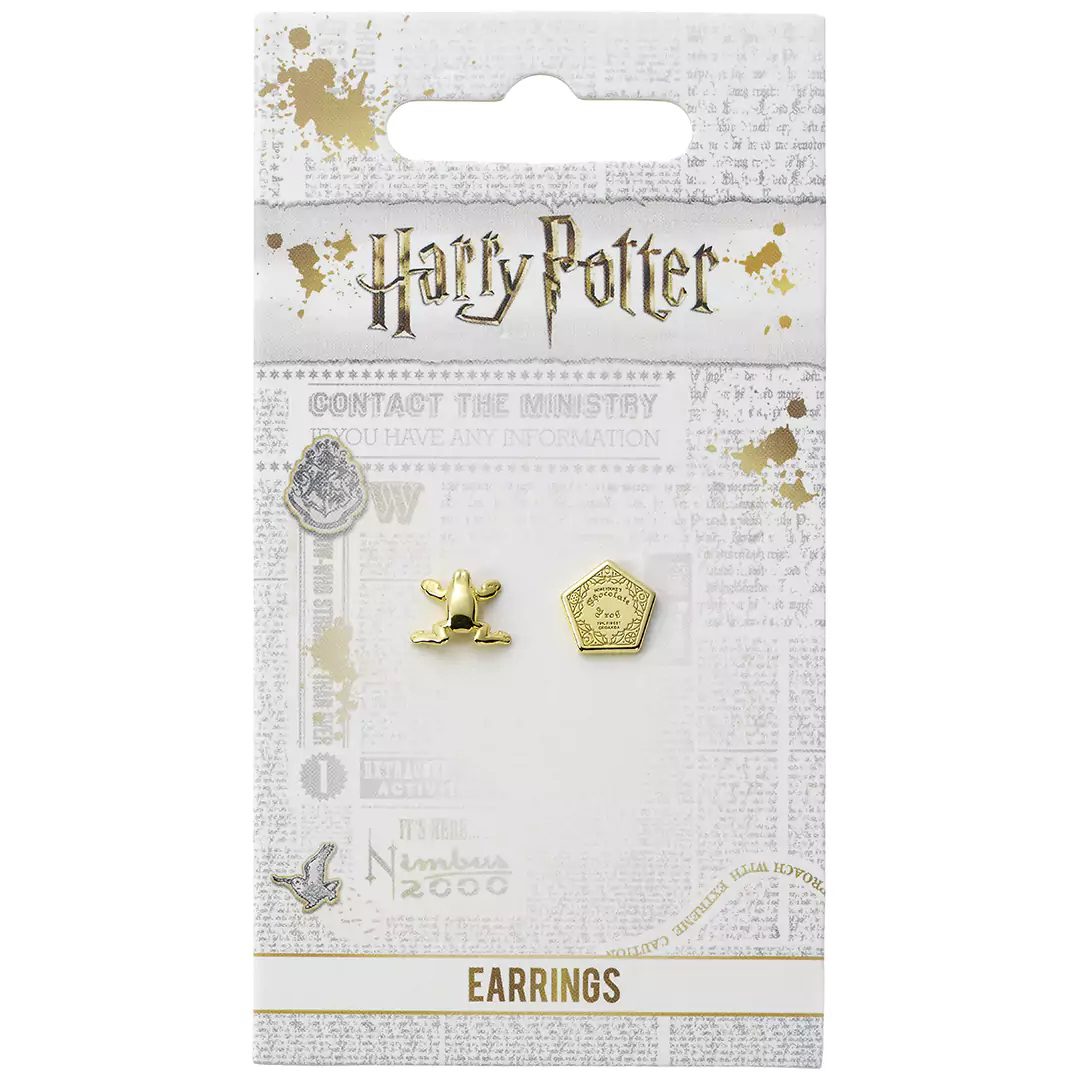 This pair of stud earrings is gold plated, features a small frog as well as the front of the chocolate frog pack