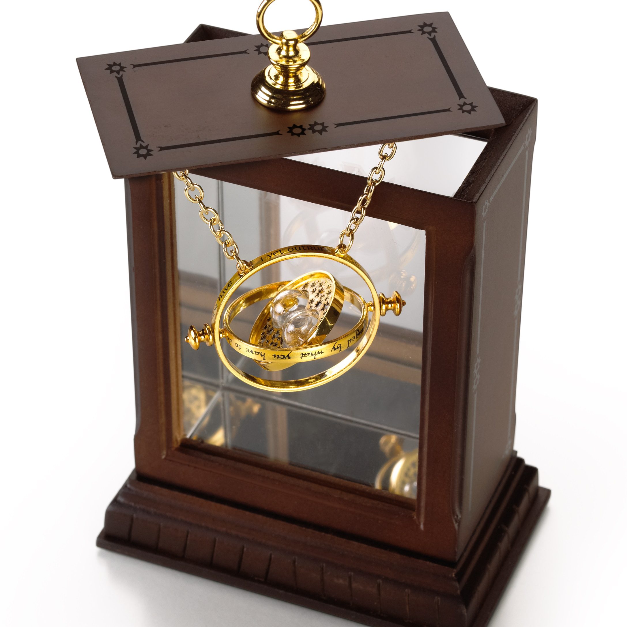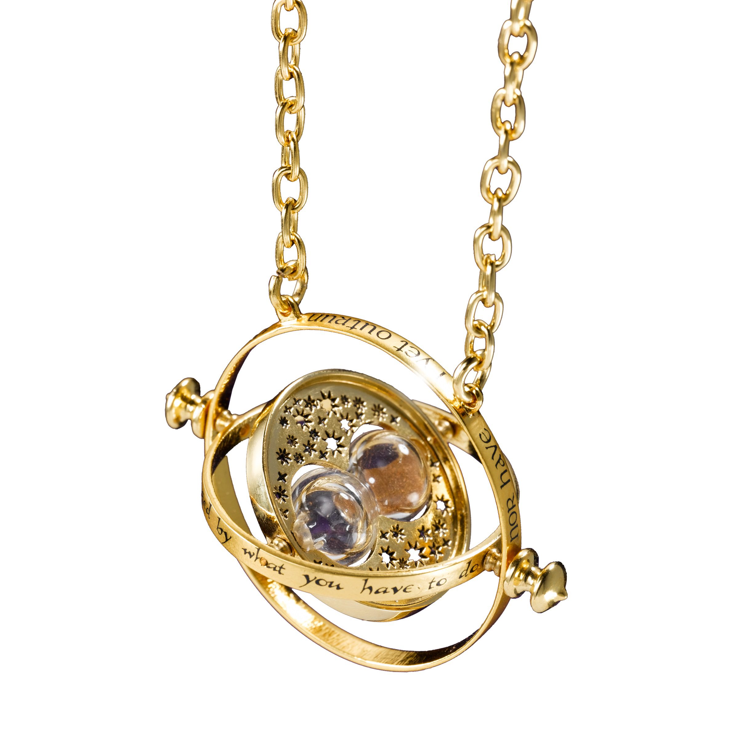 A gleaming 24k gold-plated replica of Hermione’s Time Turner, used in her third year to travel back in time to take more classes, complete with a 18″ chain and a display box.