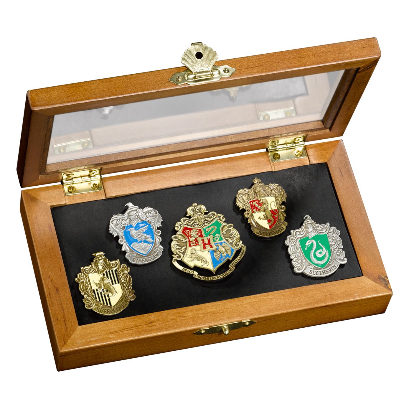 These quality hand-enameled Hogwarts house pins can be proudly displayed within the wooden collector’s box or worn on bags, jackets and more. Set includes all five pins and collector’s box.