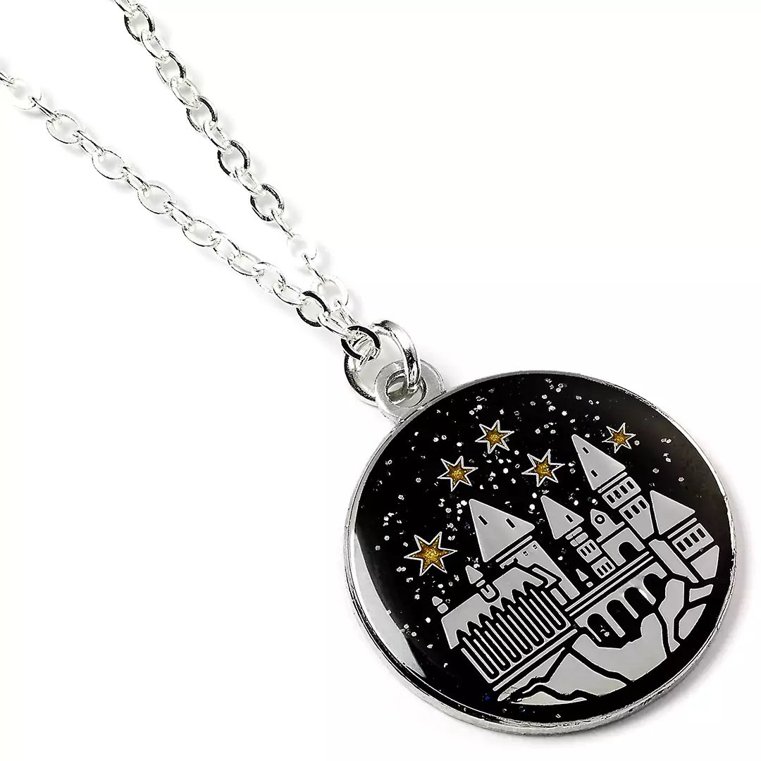 This necklace represents Hogwarts Castle under a shower of stars and on a black background. pendant and chain.