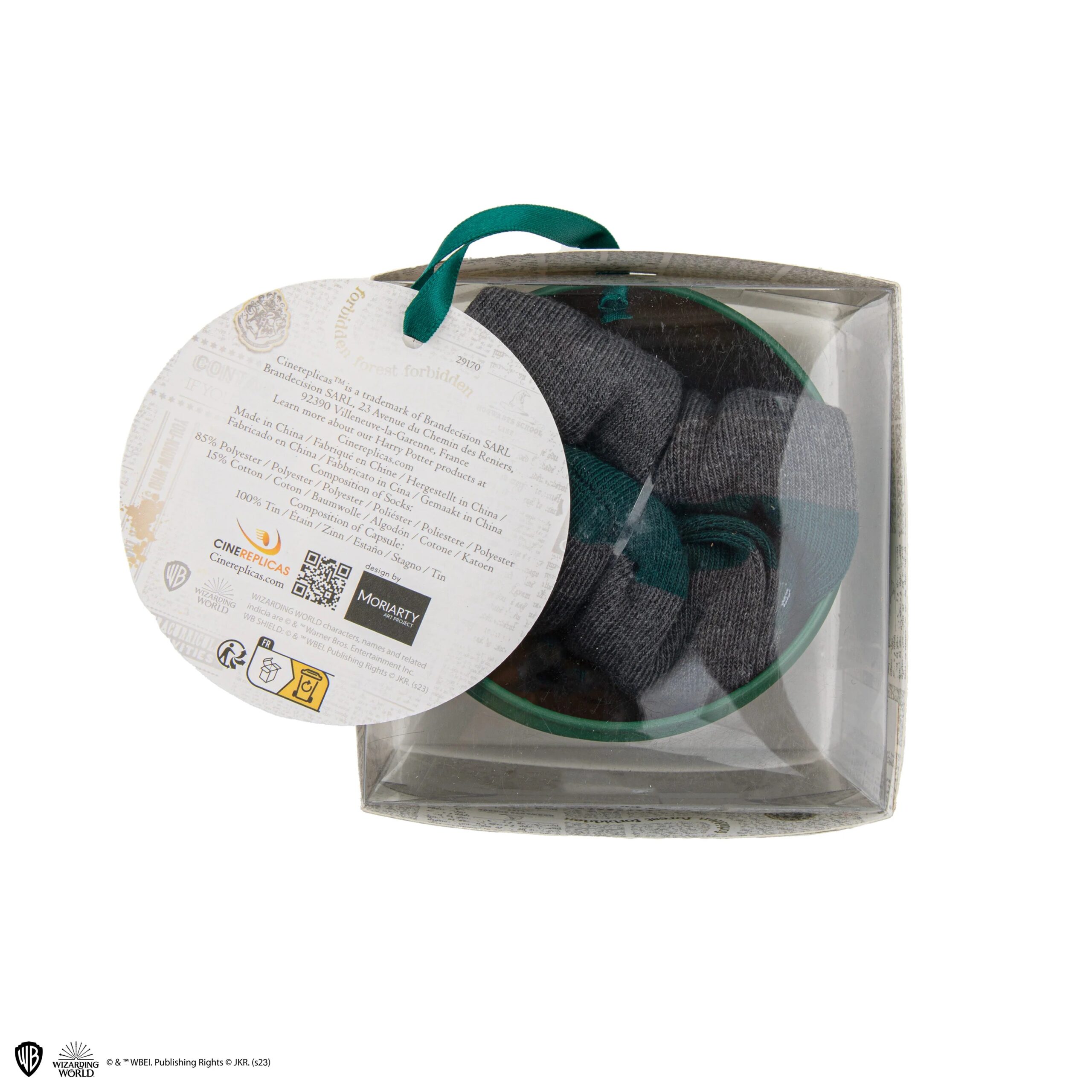 Enjoy a Christmas bauble that will look perfect hanging on your tree, or gift this ornament to your loved ones for them to discover a surprise gift on the inside: a one-size Slytherin-inspired pair of socks. Reusable every Christmas, hide more presents or sweets inside to bring the magic of the Holidays to life. French Design Official Harry Potter Warner Bros License Cinereplicas Trademark Composition: Capsule: 100% Tin Socks: 85% Polyester & 15 % Cotton Weight: 85g Diameter of Capsule: 8.5 cm / 3.34 in Socks size: USA: 4 – 11 Europe: 35 – 45 UK: 2 – 10