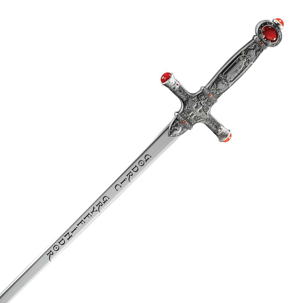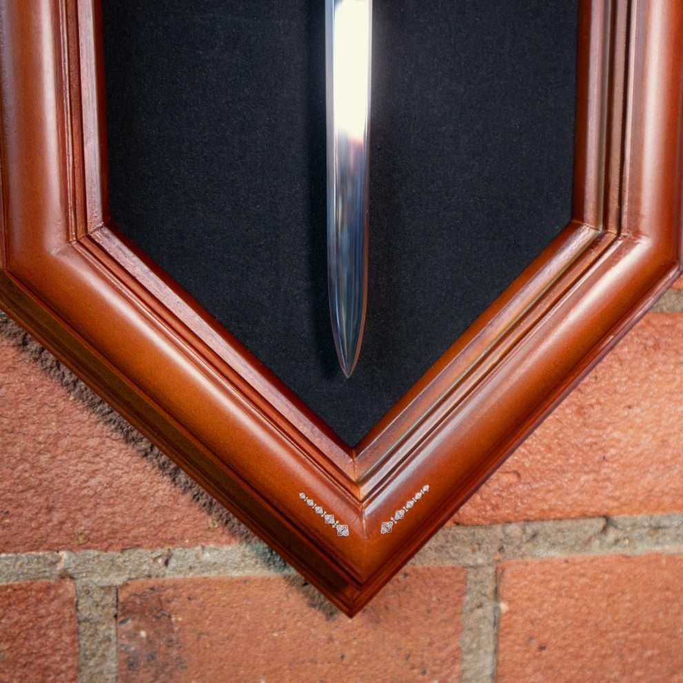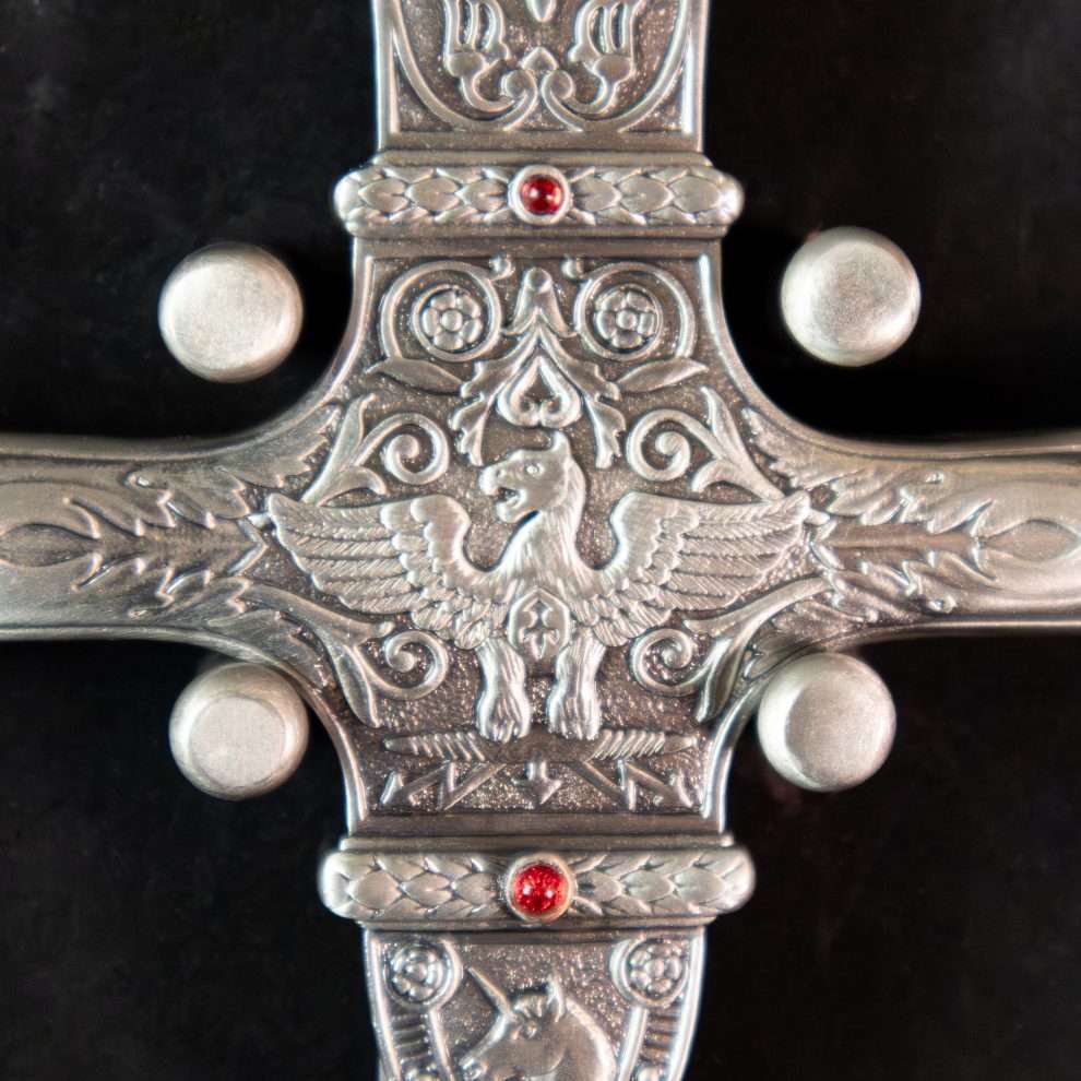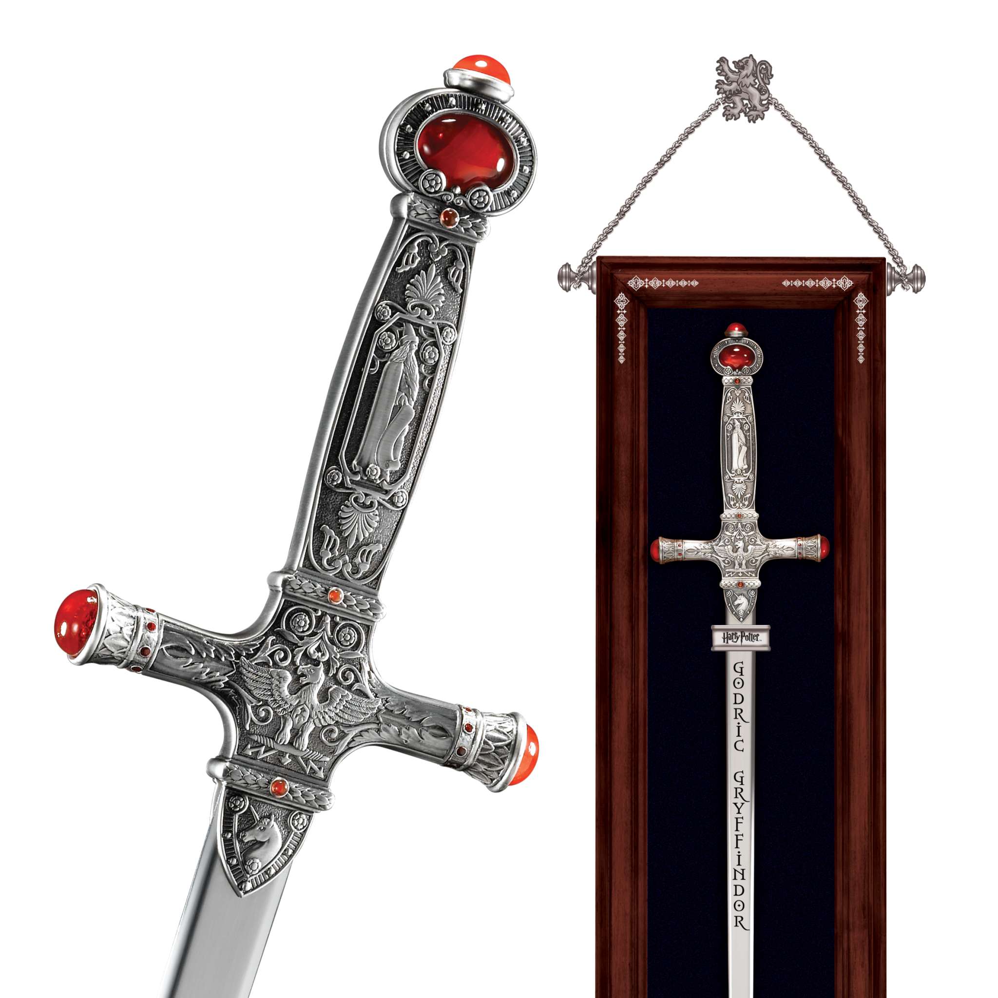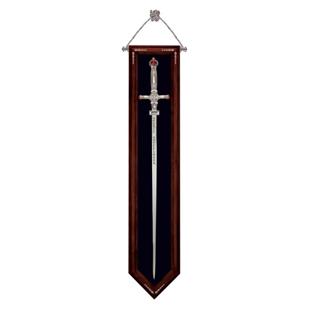 An exquisite recreation of Godric Gryffindor’s sword, with an intricately detailed handle set with crystal cabochons, affixed to a beautiful wood display plaque.