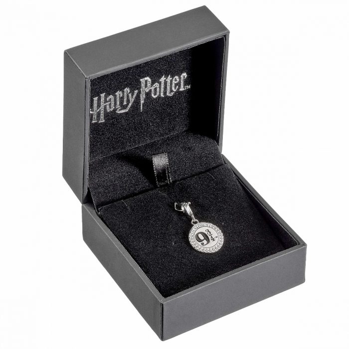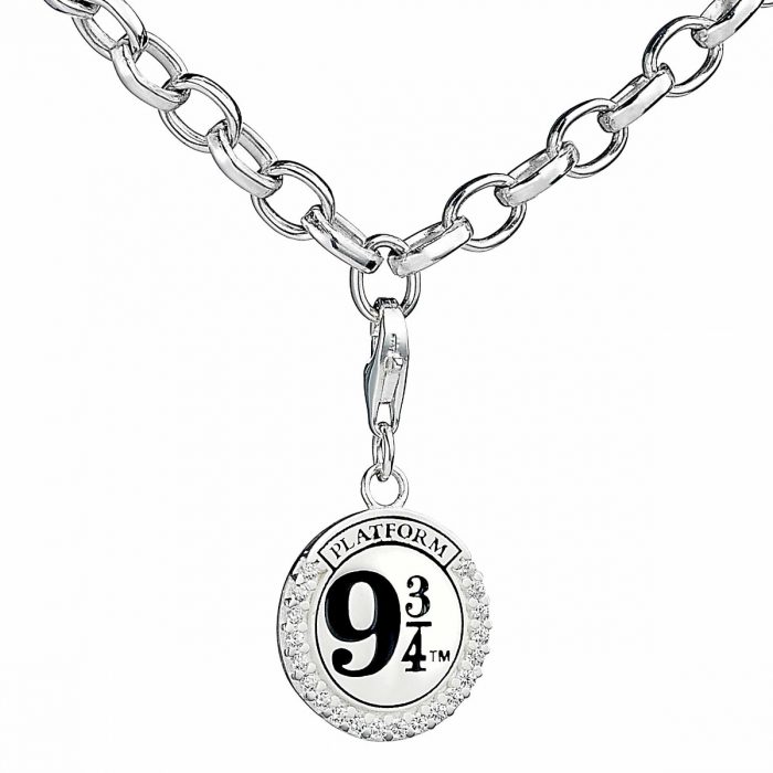 Harry Potter Sterling Silver Platform 9 ? clip on Charm with Crystal Elements This Harry Potter Platform 9 3/4 charm with Crystal elements and can be clipped to a link bracelet or necklace This charm depicts the famous Platform at Kings Cross Station from where Hogwart students gain access to the Hogwarts Express Presented in official Harry Potter branded packaging showing the Warner Bros logo. There is a matching necklace in this collection. The Carat Shop are the official licensed manufacturers of Harry Potter Jewellery on behalf of Warner Bros.