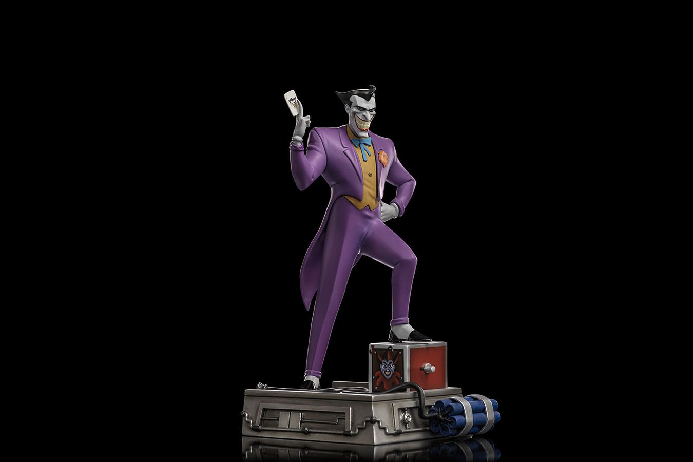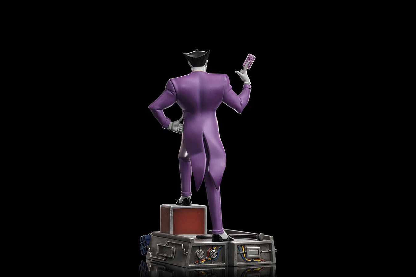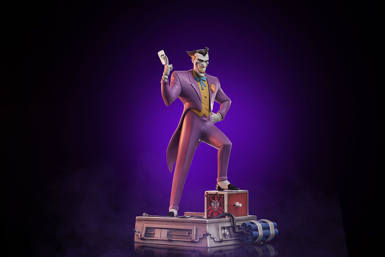 Holding one of the razor-sharp playing cards between the fingers of his right hand, with the representation of the suit that originated his name, the Clown Prince of Crime with his wide smile and dark eyes with the yellow sclera, presents himself on a technological pedestal leaning on his left leg on a mysterious “Jack-in-the-box”, an old toy in the shape of a box with a crank, that when turned plays a melody and revels a surprise figure in the end, in this case, almost always lethal. Wearing his classic purple tailcoat with an orange shirt and green bowtie, with his inseparable Acid Flower stick to his lapel, Iron Studios present their statue “Joker – Batman The Animated Series – Art Scale 1/10”, presenting the stylized classic version created by illustrator, animator, and writer Bruce Timm, celebrating the 30th anniversary of Dark Knight’s iconic animated series from 1992, that originated what is today called the DC Animated Universe.