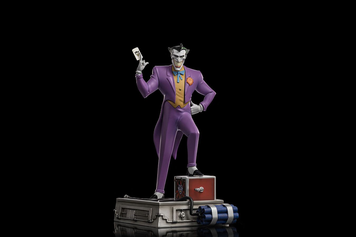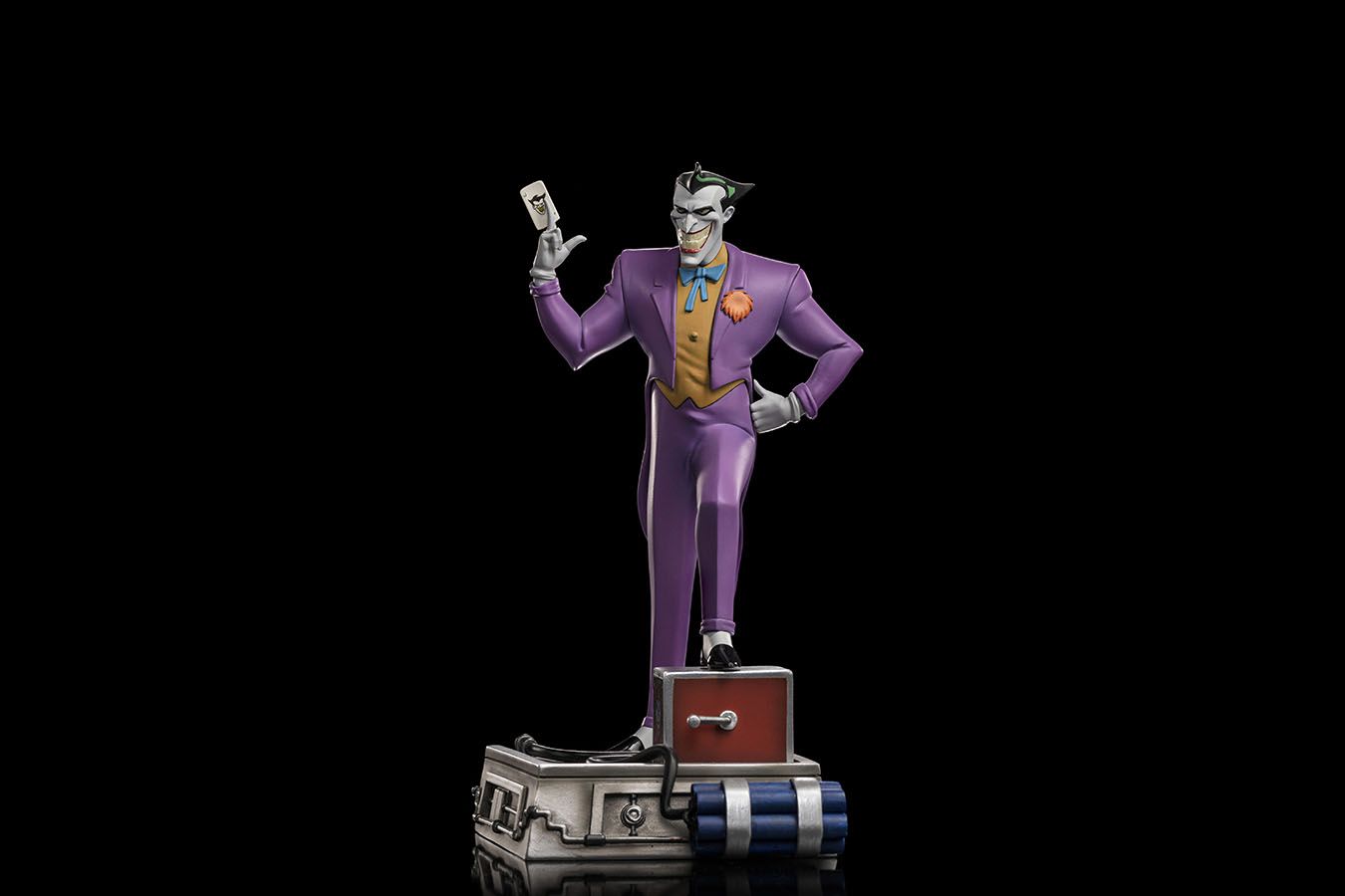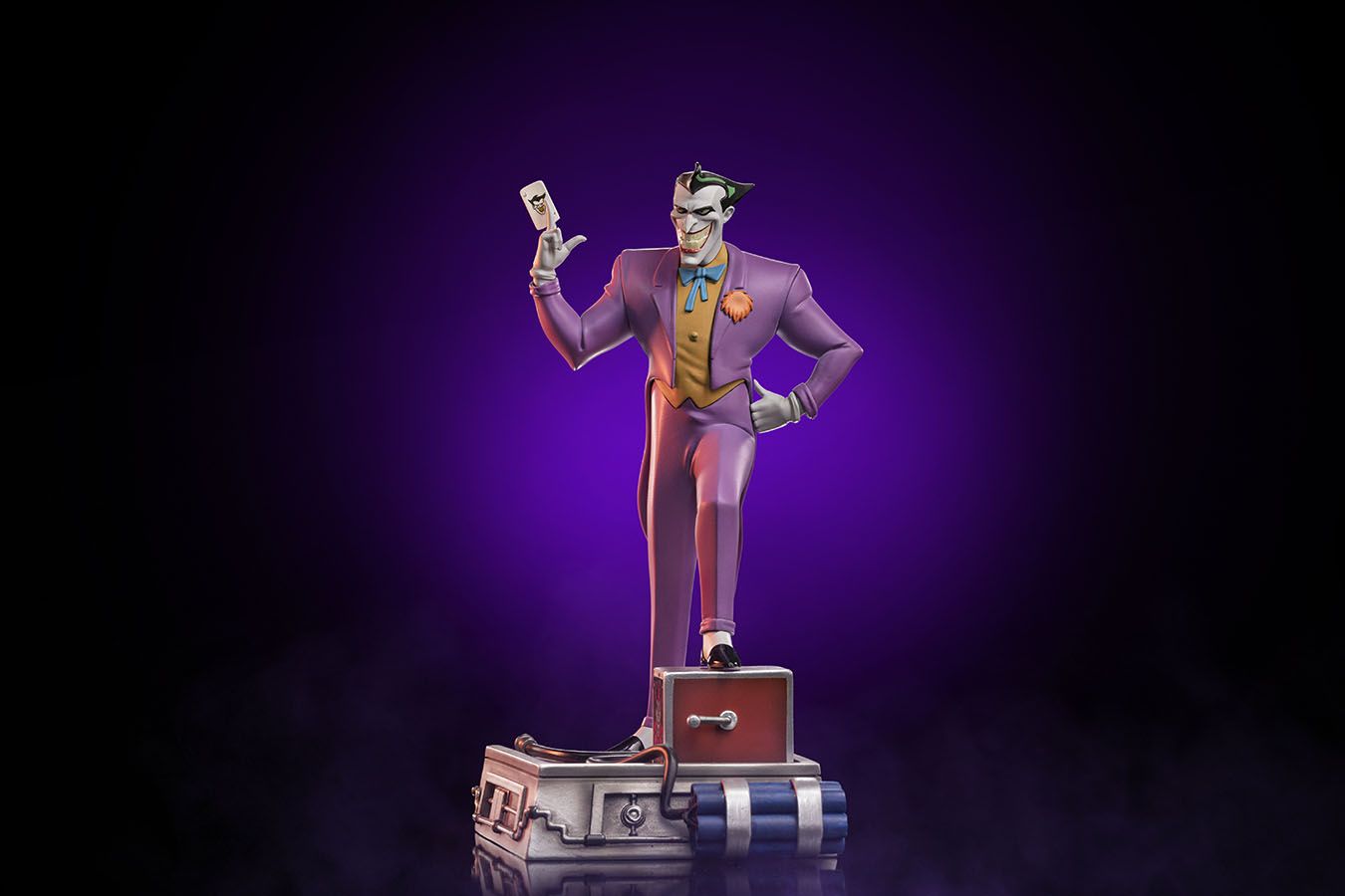 Holding one of the razor-sharp playing cards between the fingers of his right hand, with the representation of the suit that originated his name, the Clown Prince of Crime with his wide smile and dark eyes with the yellow sclera, presents himself on a technological pedestal leaning on his left leg on a mysterious “Jack-in-the-box”, an old toy in the shape of a box with a crank, that when turned plays a melody and revels a surprise figure in the end, in this case, almost always lethal. Wearing his classic purple tailcoat with an orange shirt and green bowtie, with his inseparable Acid Flower stick to his lapel, Iron Studios present their statue “Joker – Batman The Animated Series – Art Scale 1/10”, presenting the stylized classic version created by illustrator, animator, and writer Bruce Timm, celebrating the 30th anniversary of Dark Knight’s iconic animated series from 1992, that originated what is today called the DC Animated Universe.