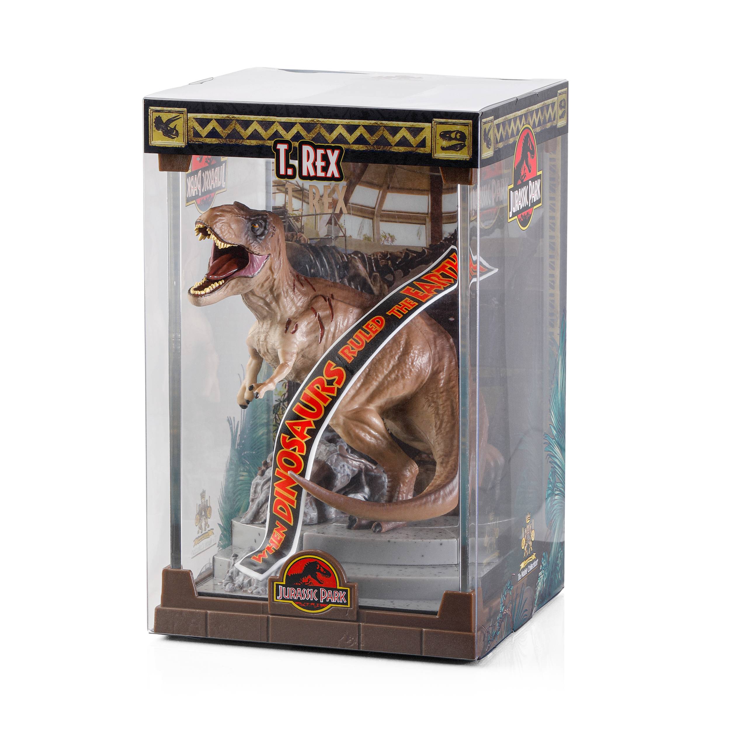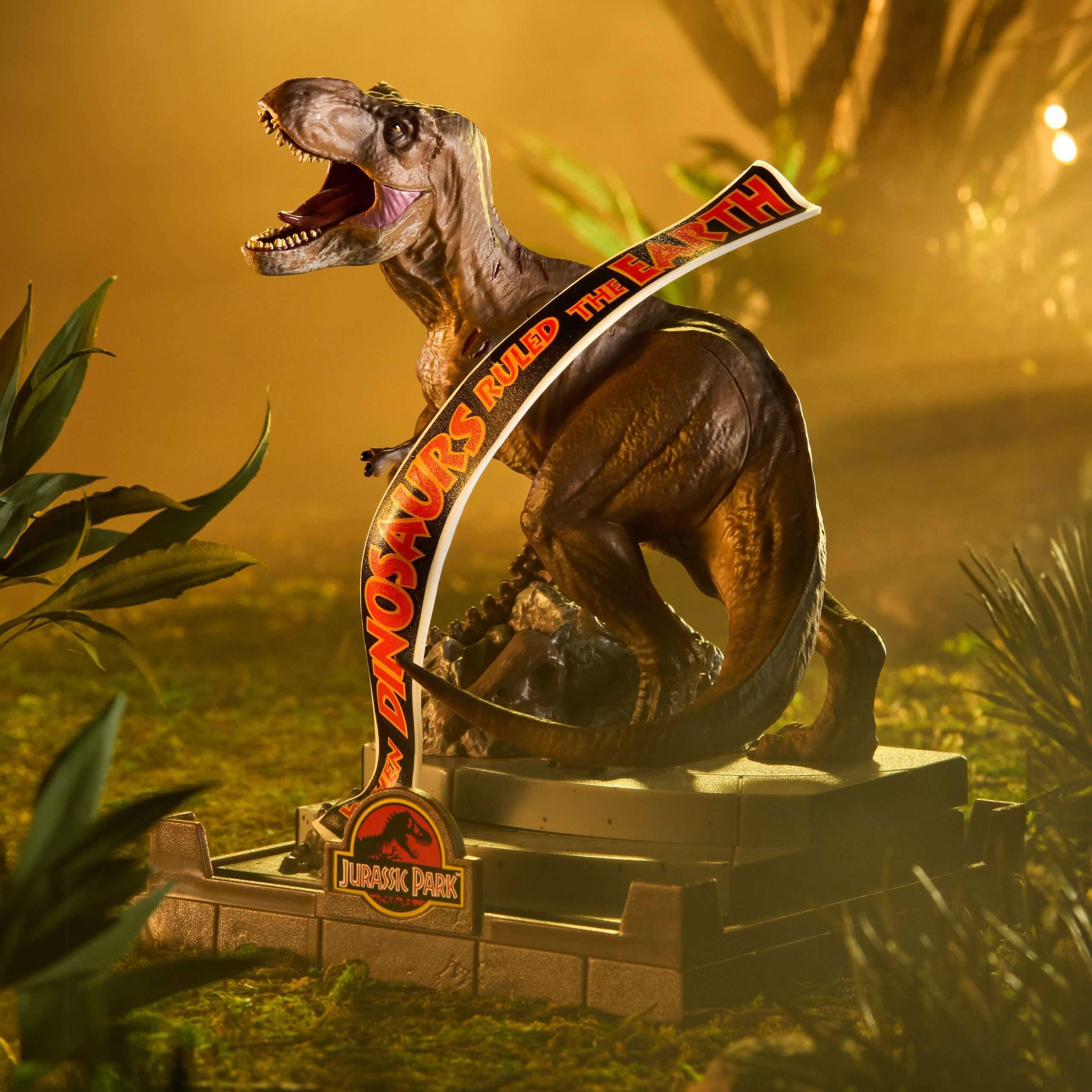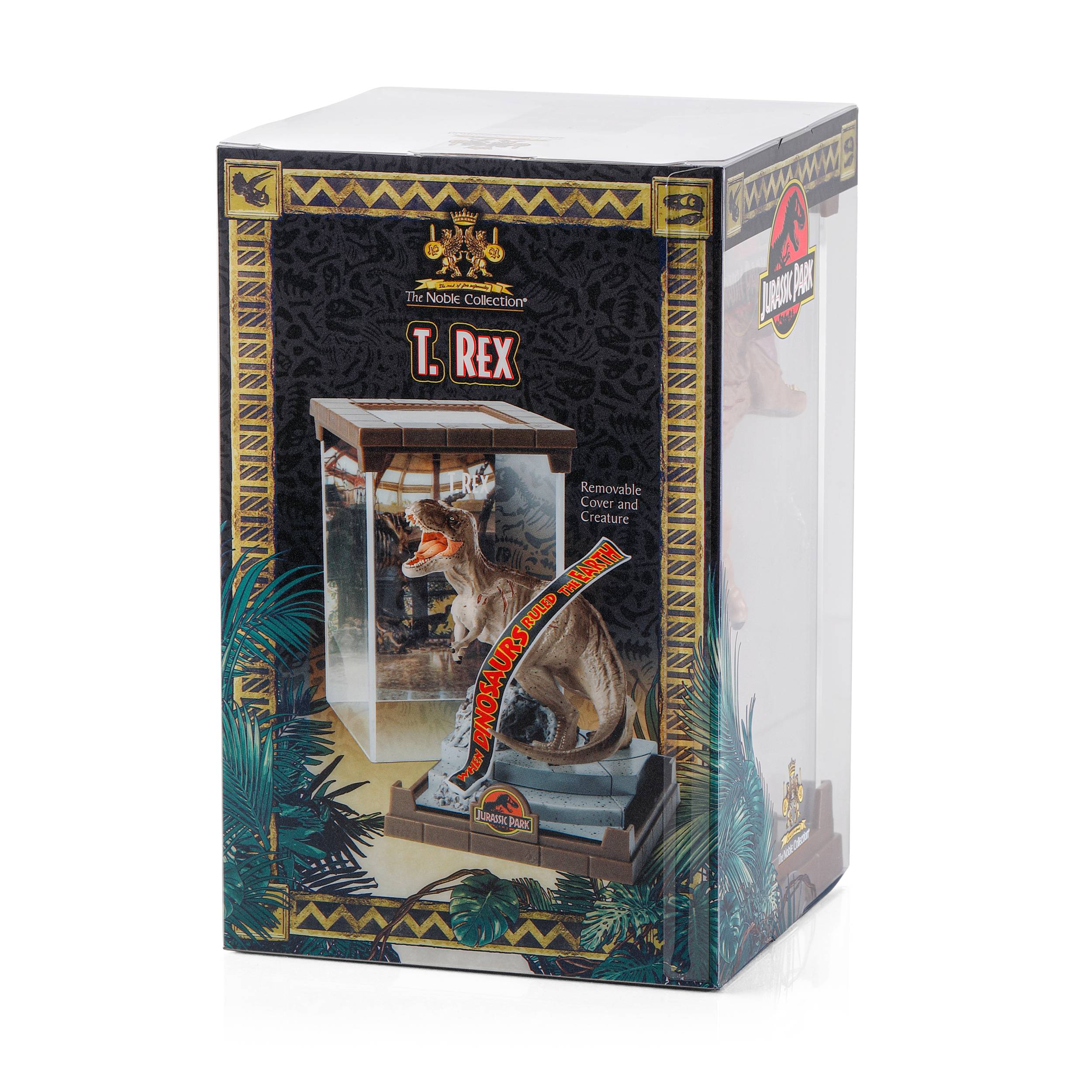 The formidable Tyrannosaurus Rex from the Jurassic Park franchise is brought to life in this finely sculpted diorama.
