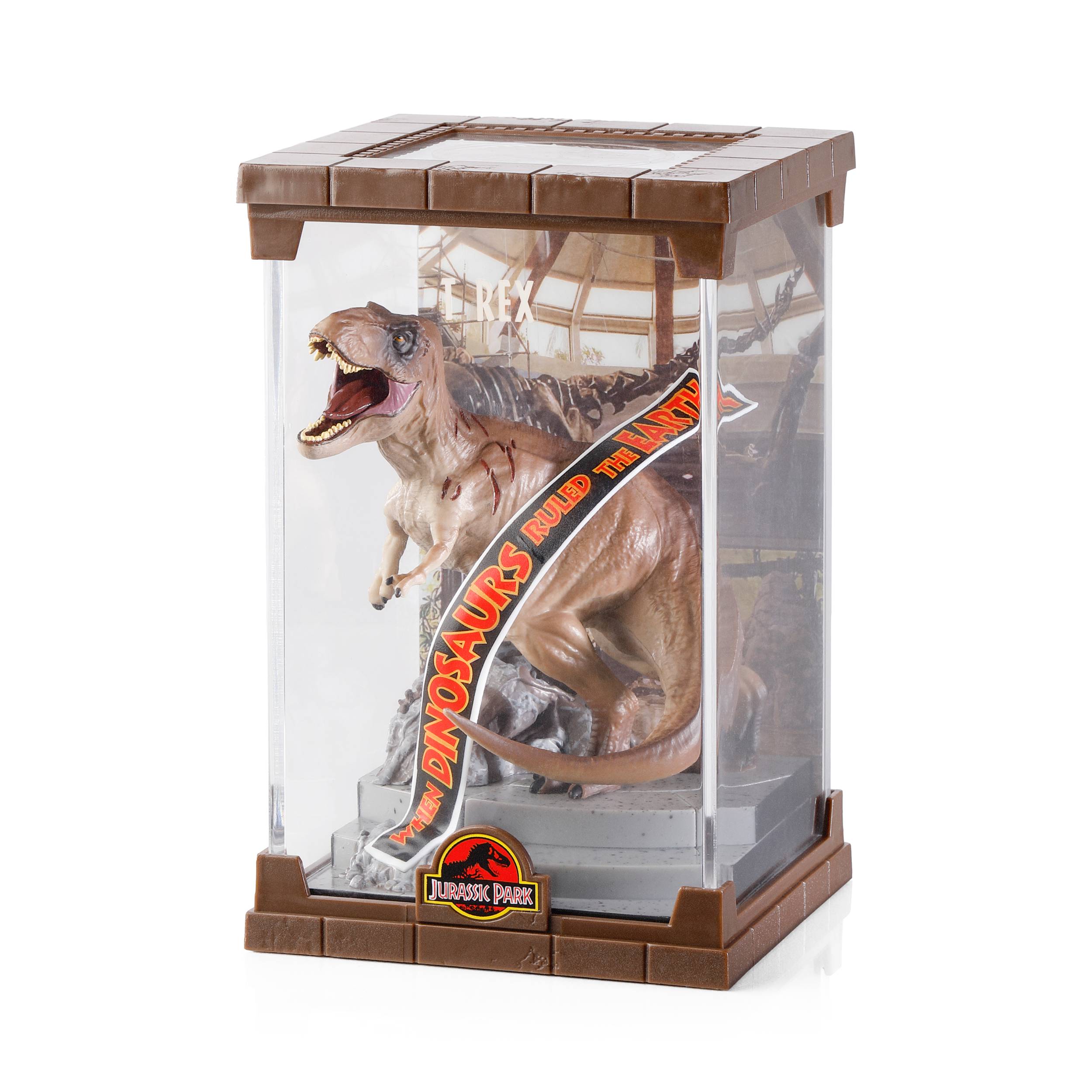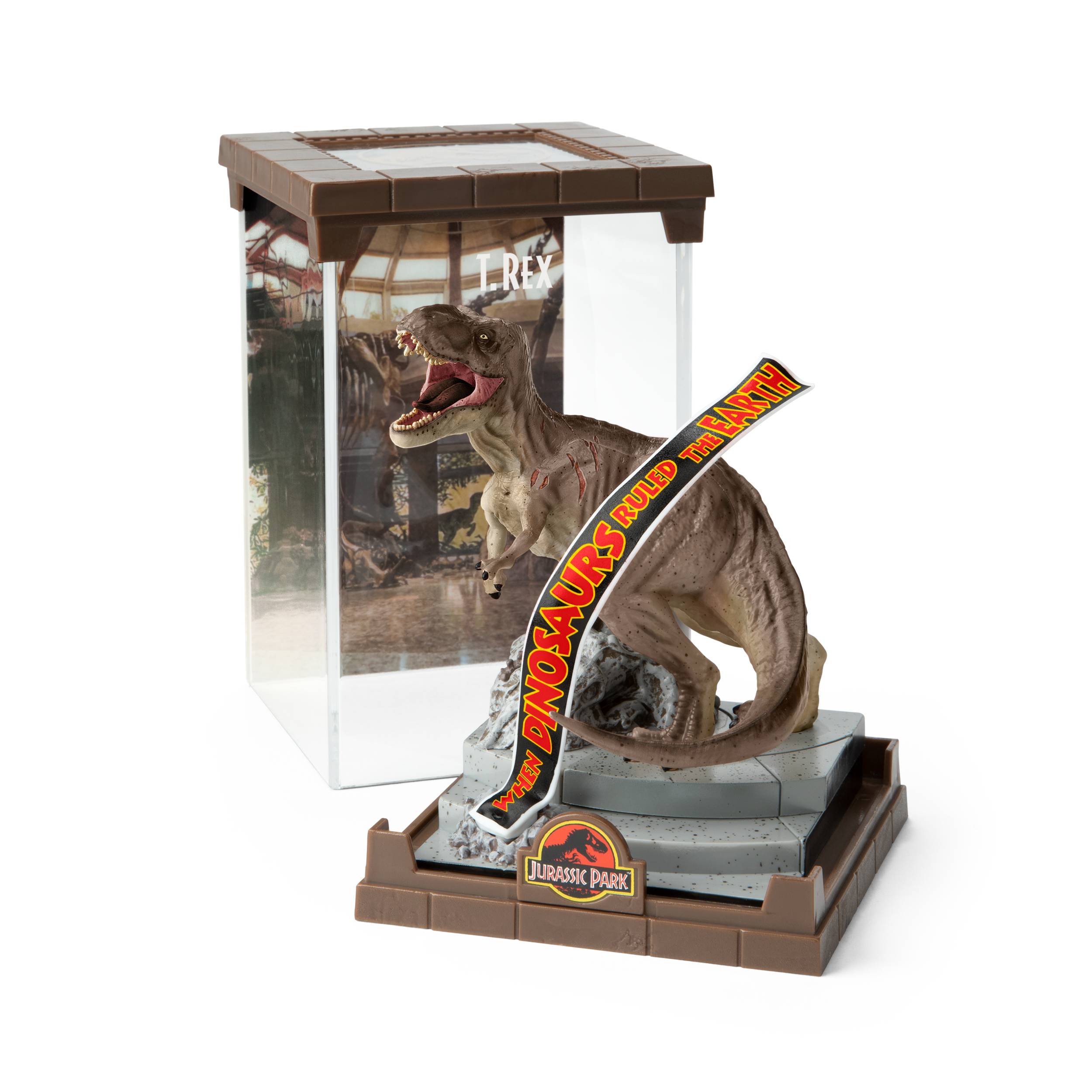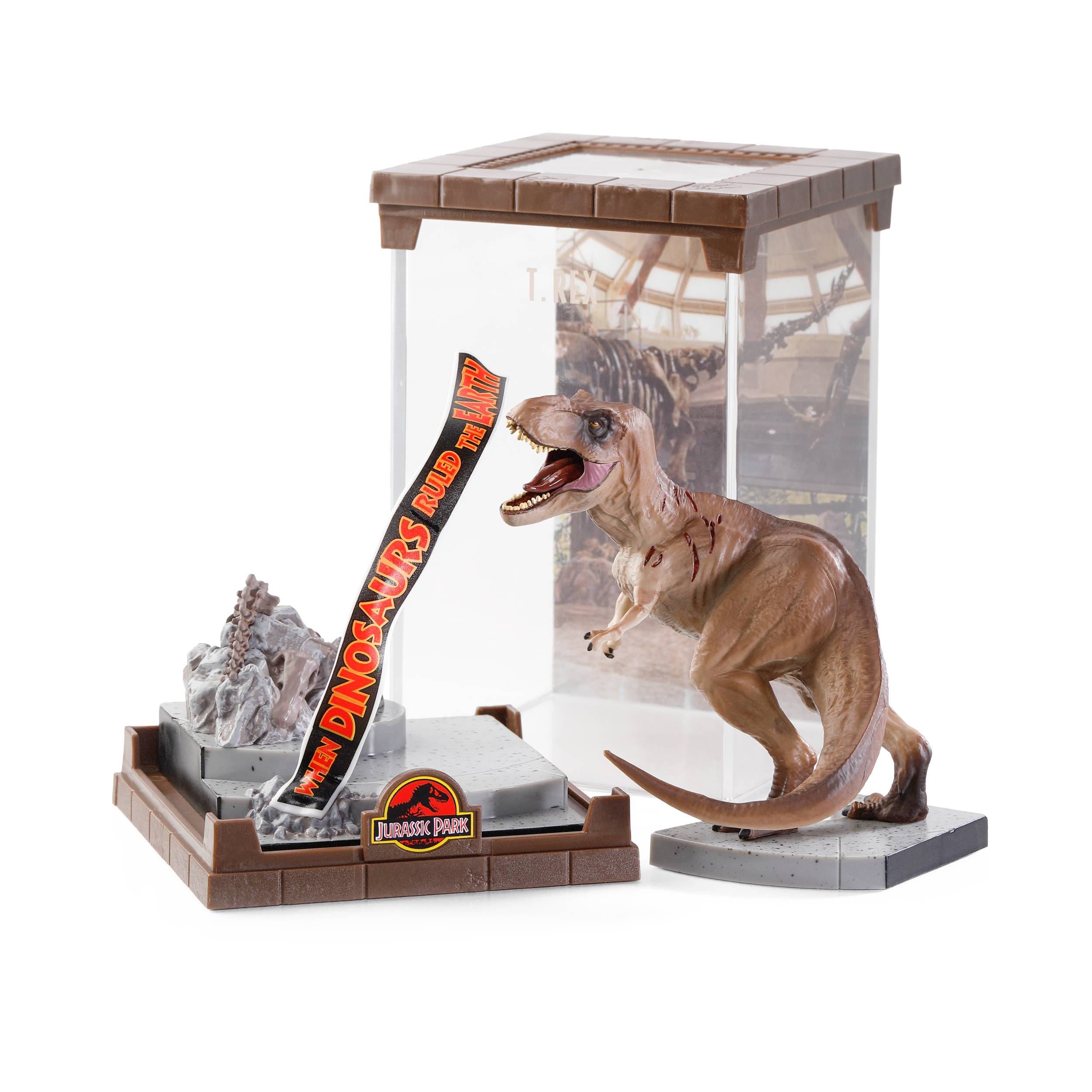 The formidable Tyrannosaurus Rex from the Jurassic Park franchise is brought to life in this finely sculpted diorama.