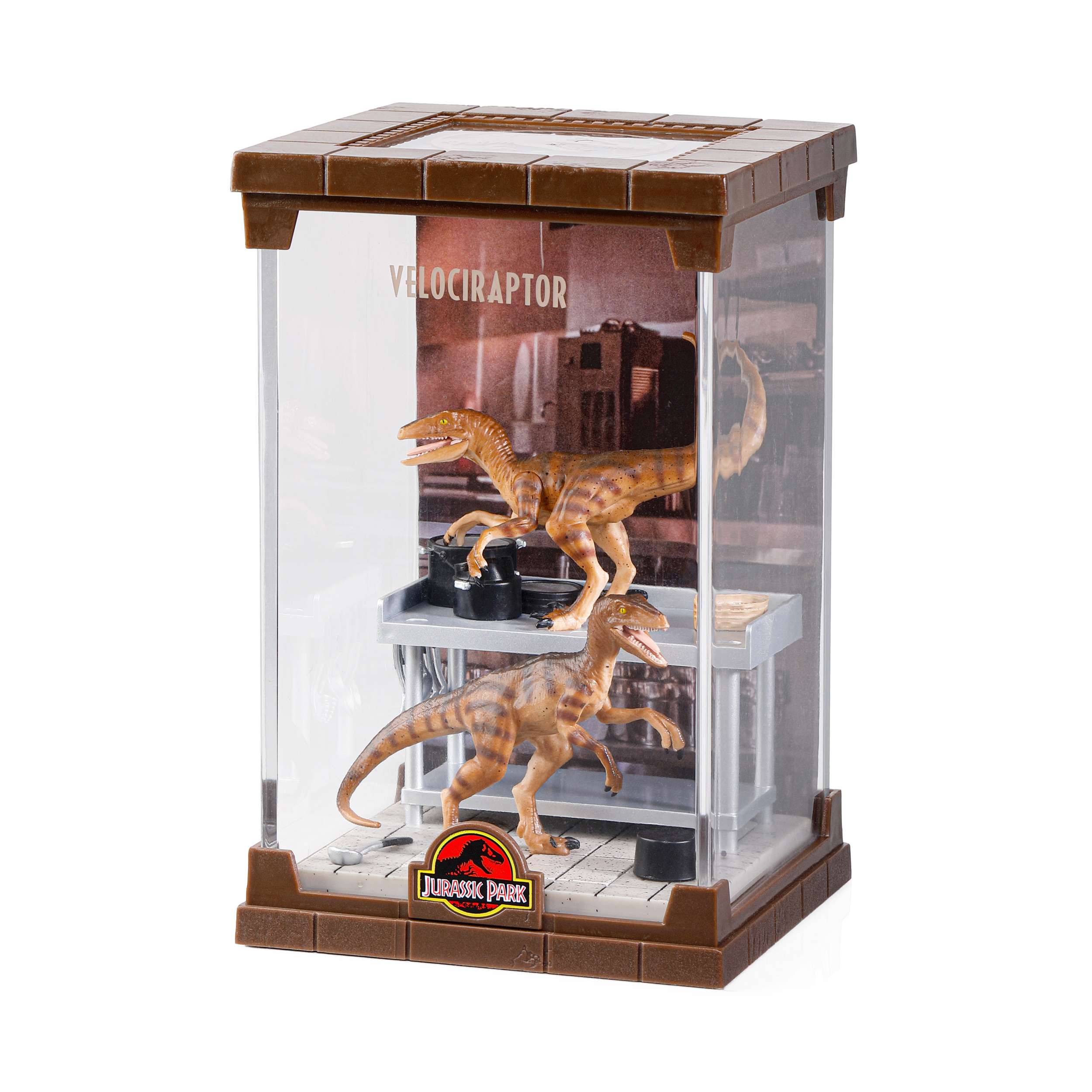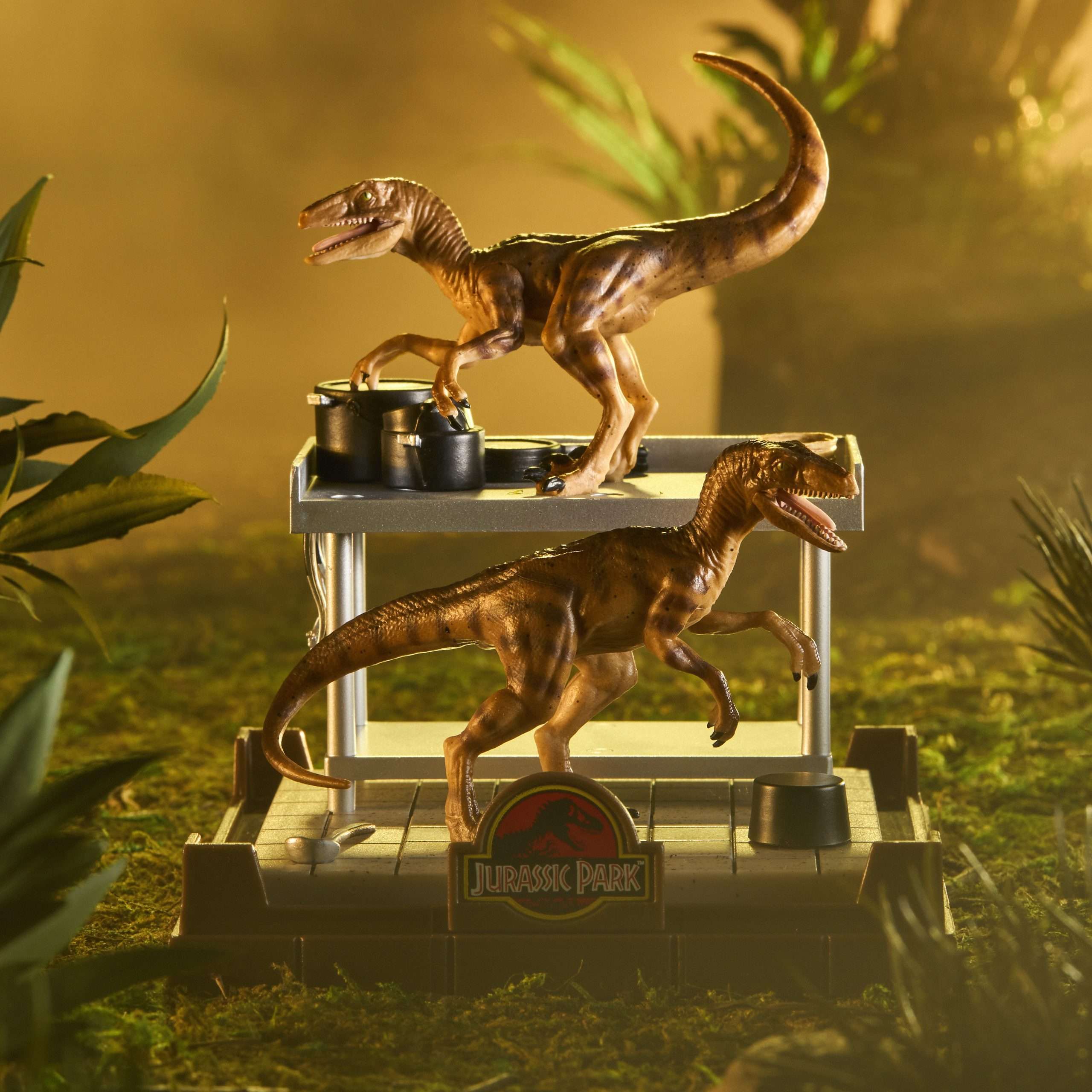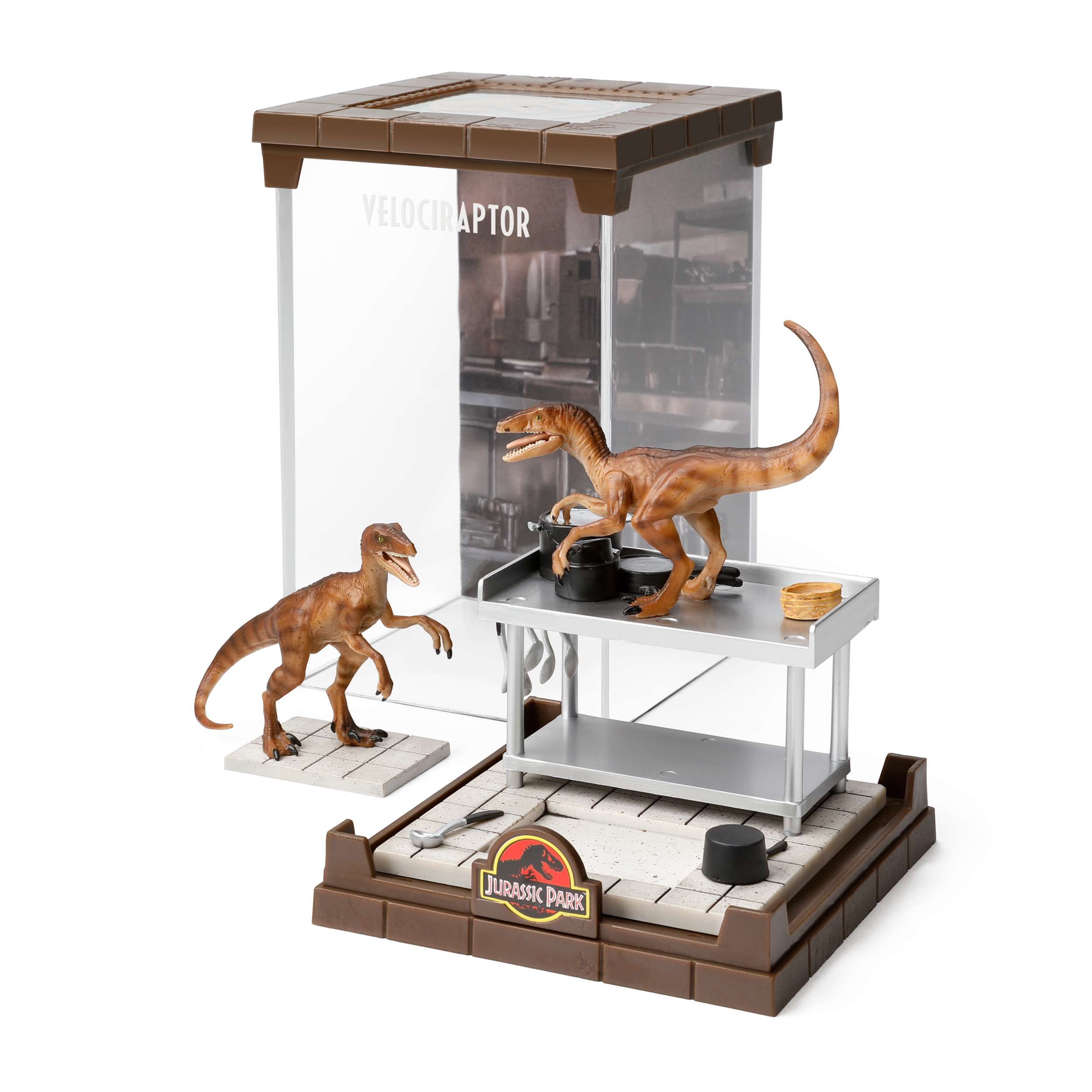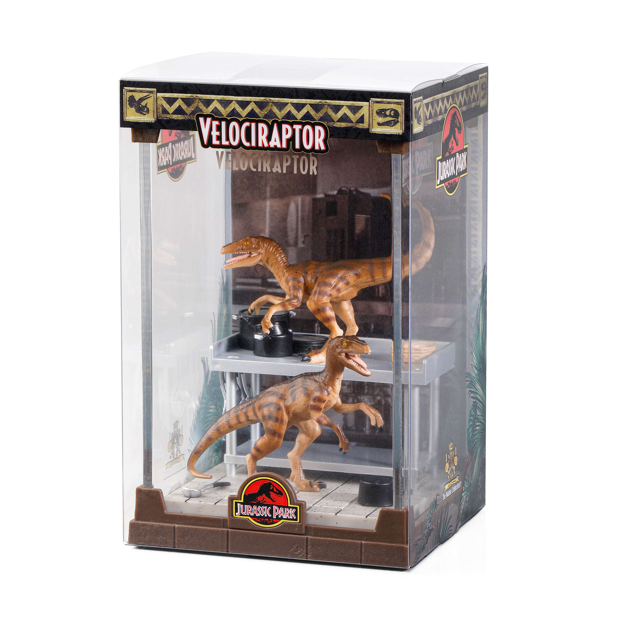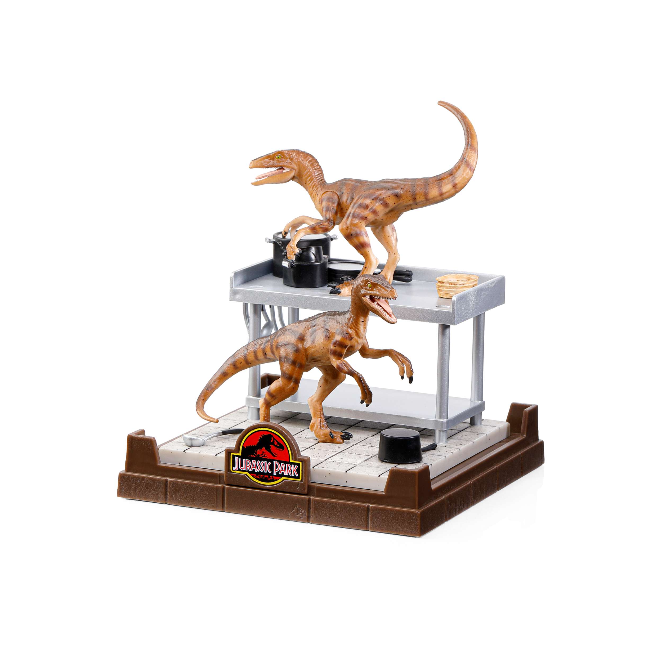 The Velociraptors from the Jurassic Park franchise are brought to life in this finely sculpted diorama featuring two dinosaurs.