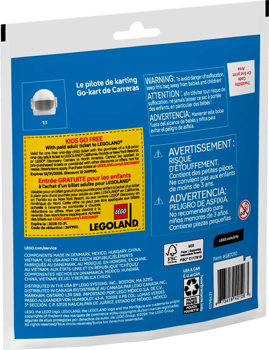 Fuel high-speed creative play with this LEGO® City Race Kart, featuring a low-profile racing vehicle with slick tires and a driver minifigure with a racing helmet.