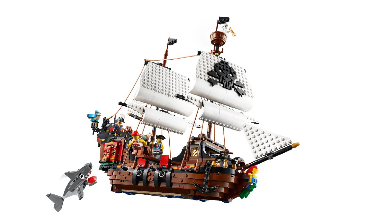 The high seas are calling! Swashbuckling adventures await pirate fans in the LEGO® Creator 3in1 Pirate Ship (31109) toy. This awesome, detailed set features a pirate ship with moving sails, cannons and a cabin with opening roof and sides, 3 minifigures, buildable figures including a shark and a parrot, plus lots of other brick-built details and cool accessories to jump-start play.
