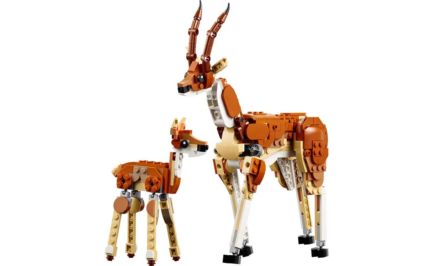 This LEGO set offers kids a world of play possibilities with 3 different animal toys to build using the same bricks. They can build a posable giraffe toy with a tree and a flamingo, rebuild it into 2 posable gazelle toys, a mother with her calf, plus 2 bushes, or turn it into a lion toy with a tree and a butterfly.