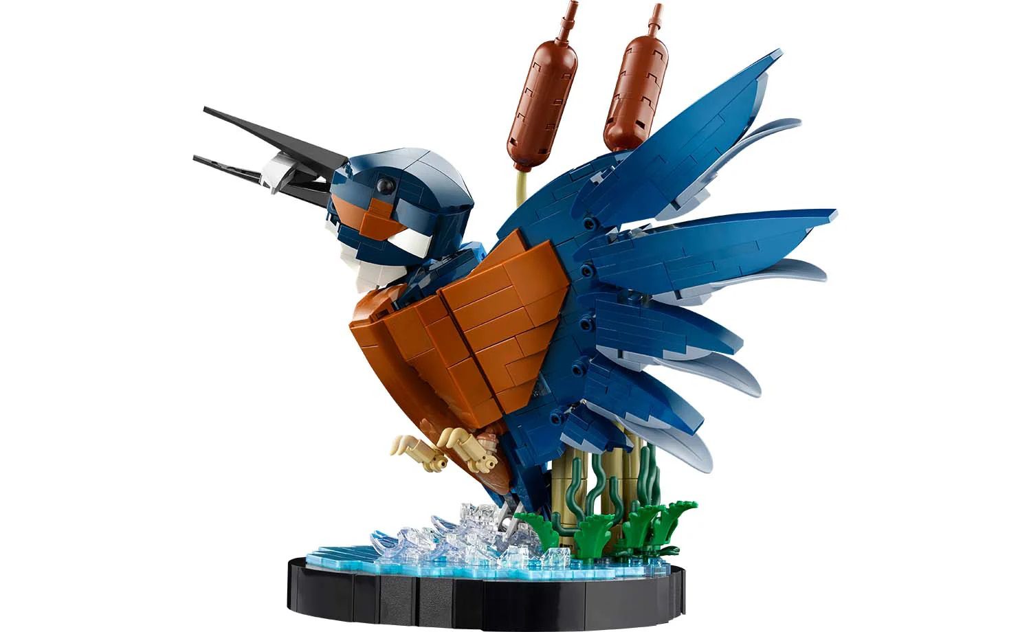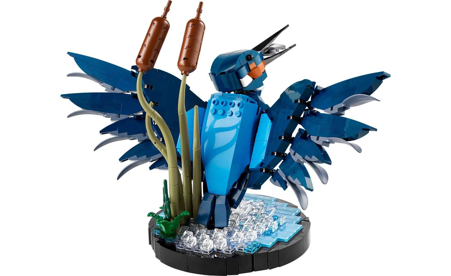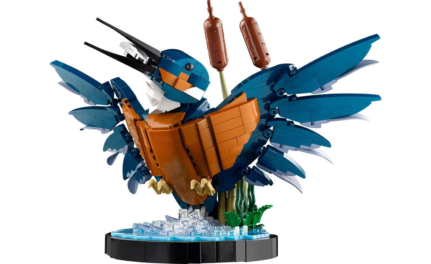 Features and functions – The model kingfisher comes with a posable head and claws, and the water setting with buildable reeds doubles as a display stand