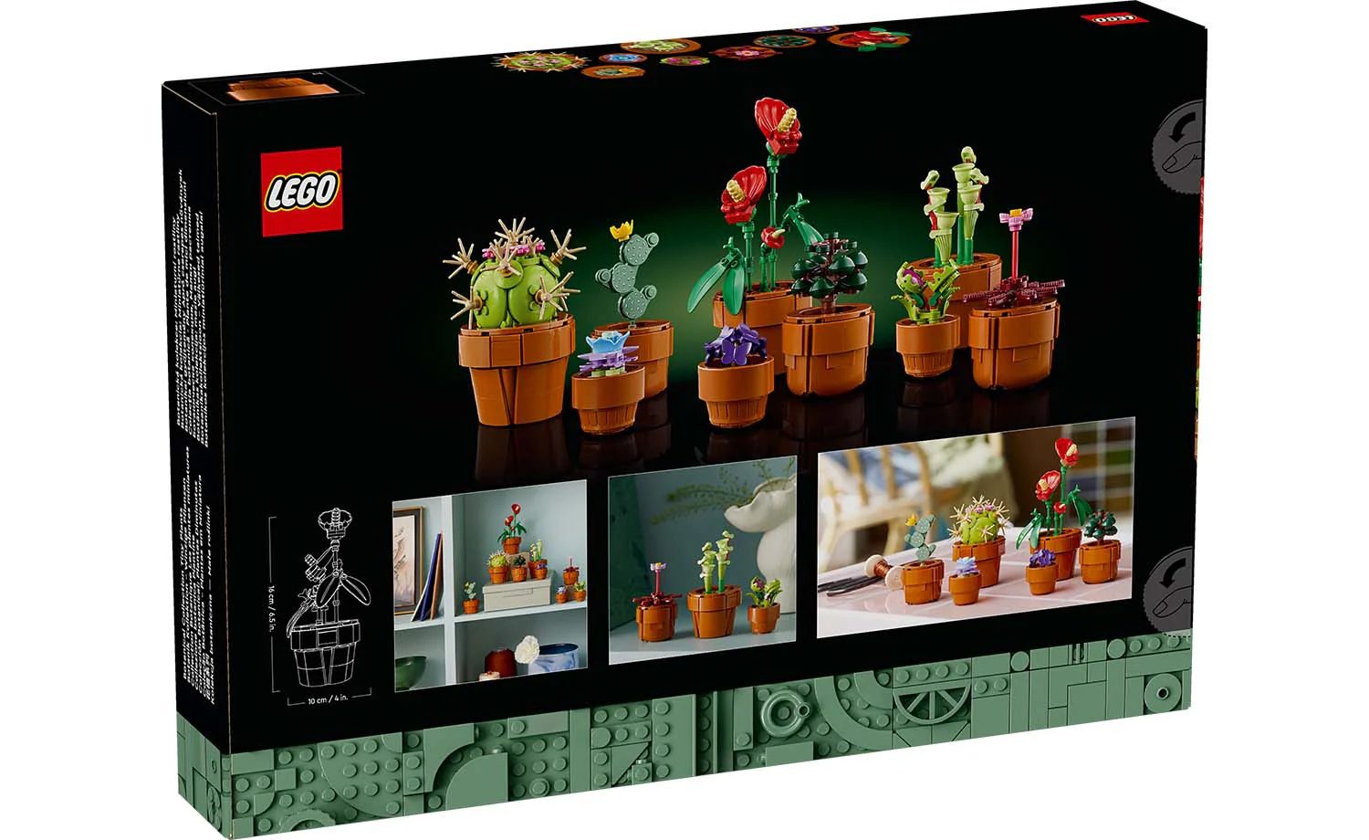 Dimensions – The tallest plant in this 758-piece building set (including its container), measures over 16 cm (6.5 in.) high, 10 cm (4 in.) wide and 6 cm (2.5 in.) deep