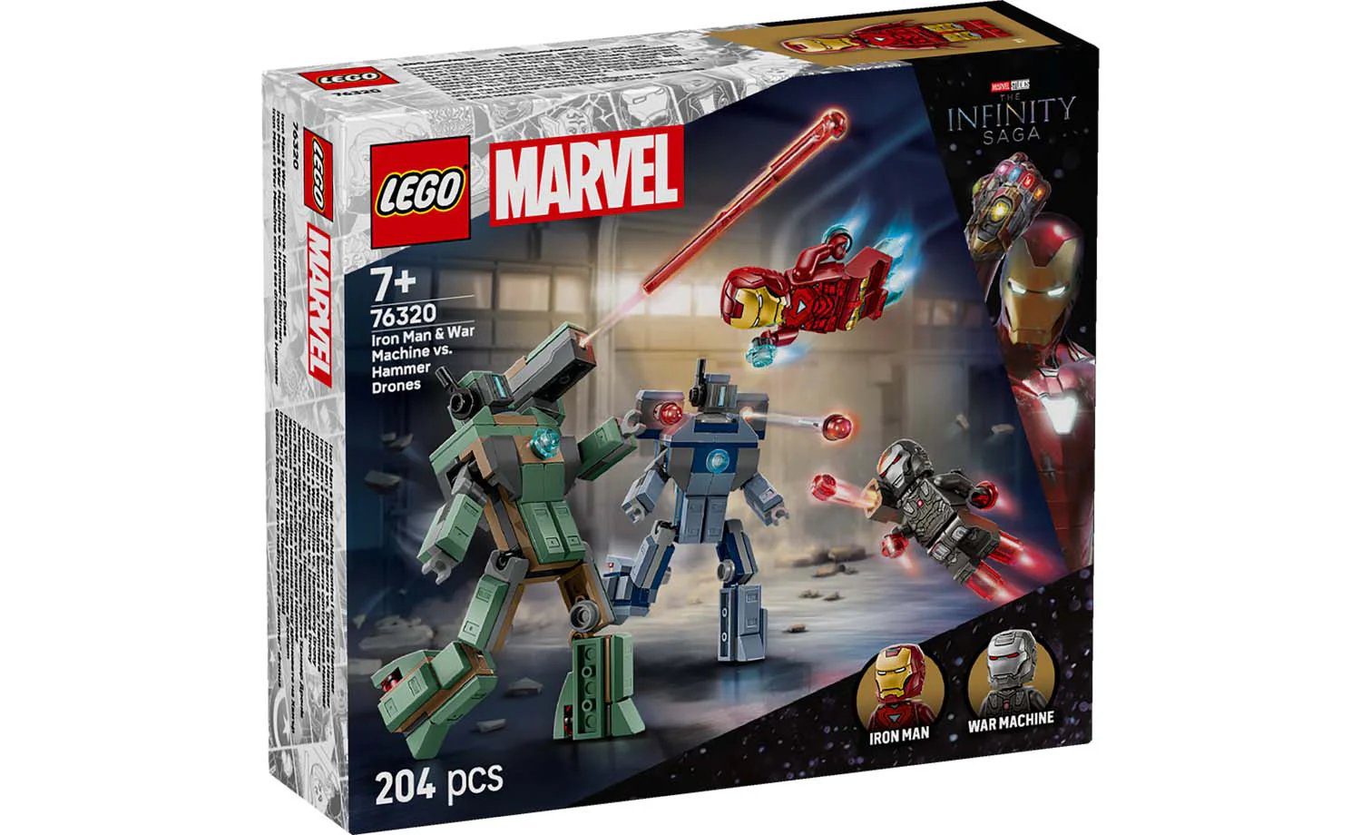 LEGO® ǀ Marvel minifigures – Includes an Iron Man minifigure with blue hand and feet blasters and laser beam weapons and a War Machine minifigure with red hand and feet blasters and a stud shooter