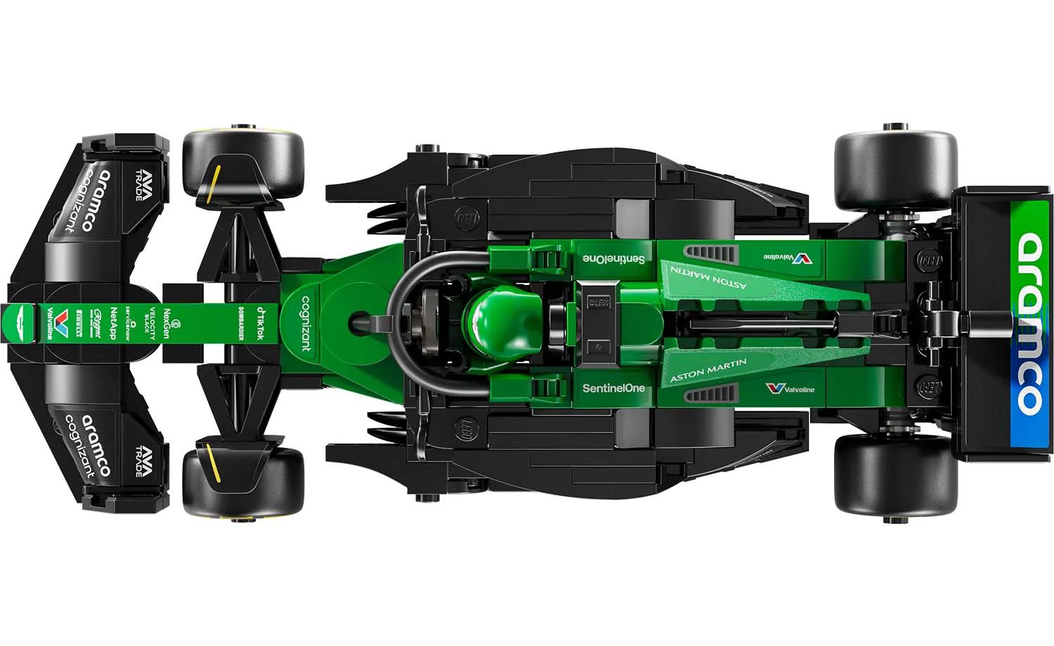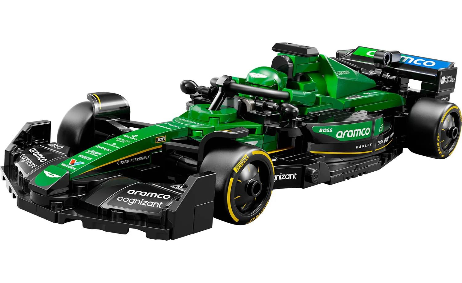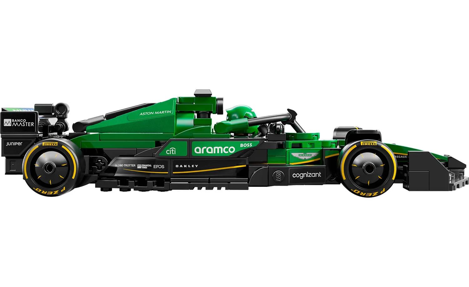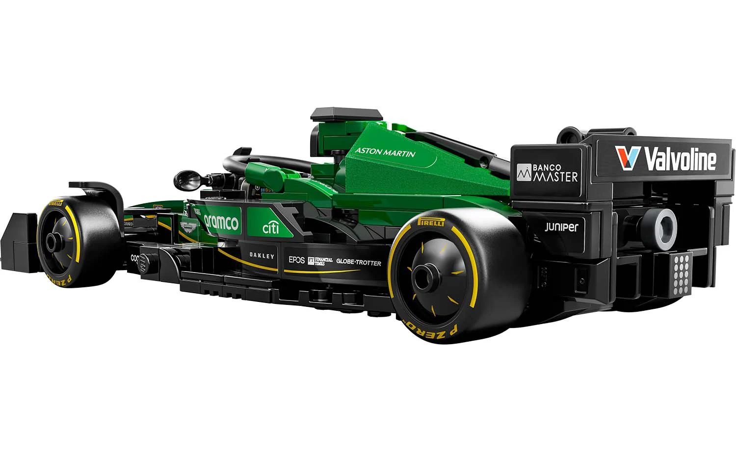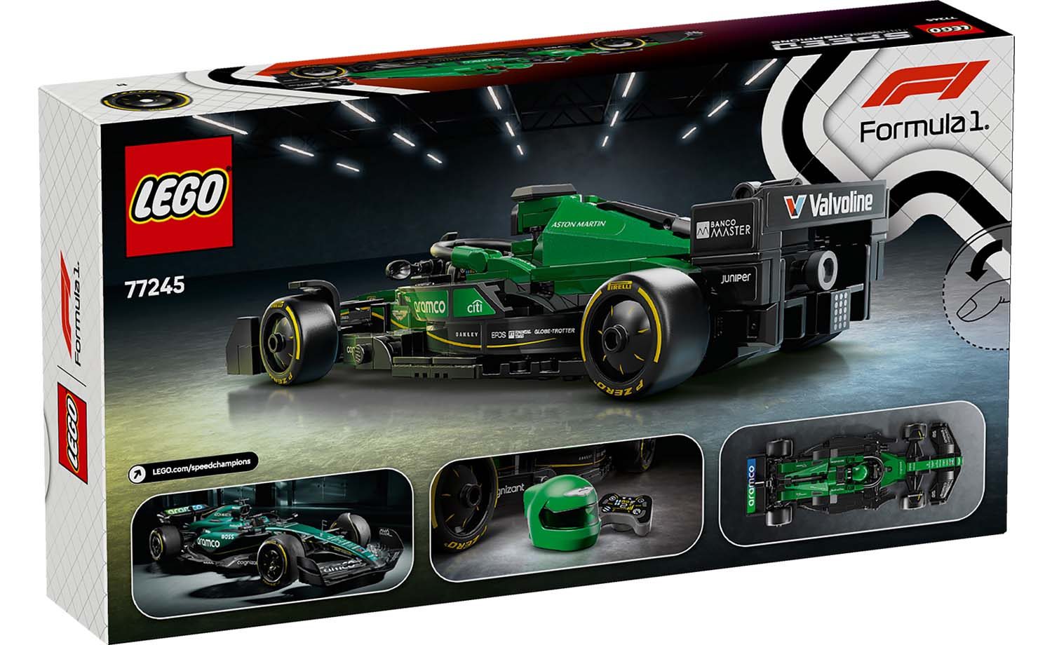 The Aston Martin Aramco F1 race car features a cockpit that opens by lifting the halo bar, a rear wing, wishbone suspension, sponsor stickers and wider rear tires imprinted with“Pirelli.” The vehicle kit comes with a driver minifigure in an Aston Martin Aramco F1 outfit and a winged helmet to place inside the cockpit and stage races.