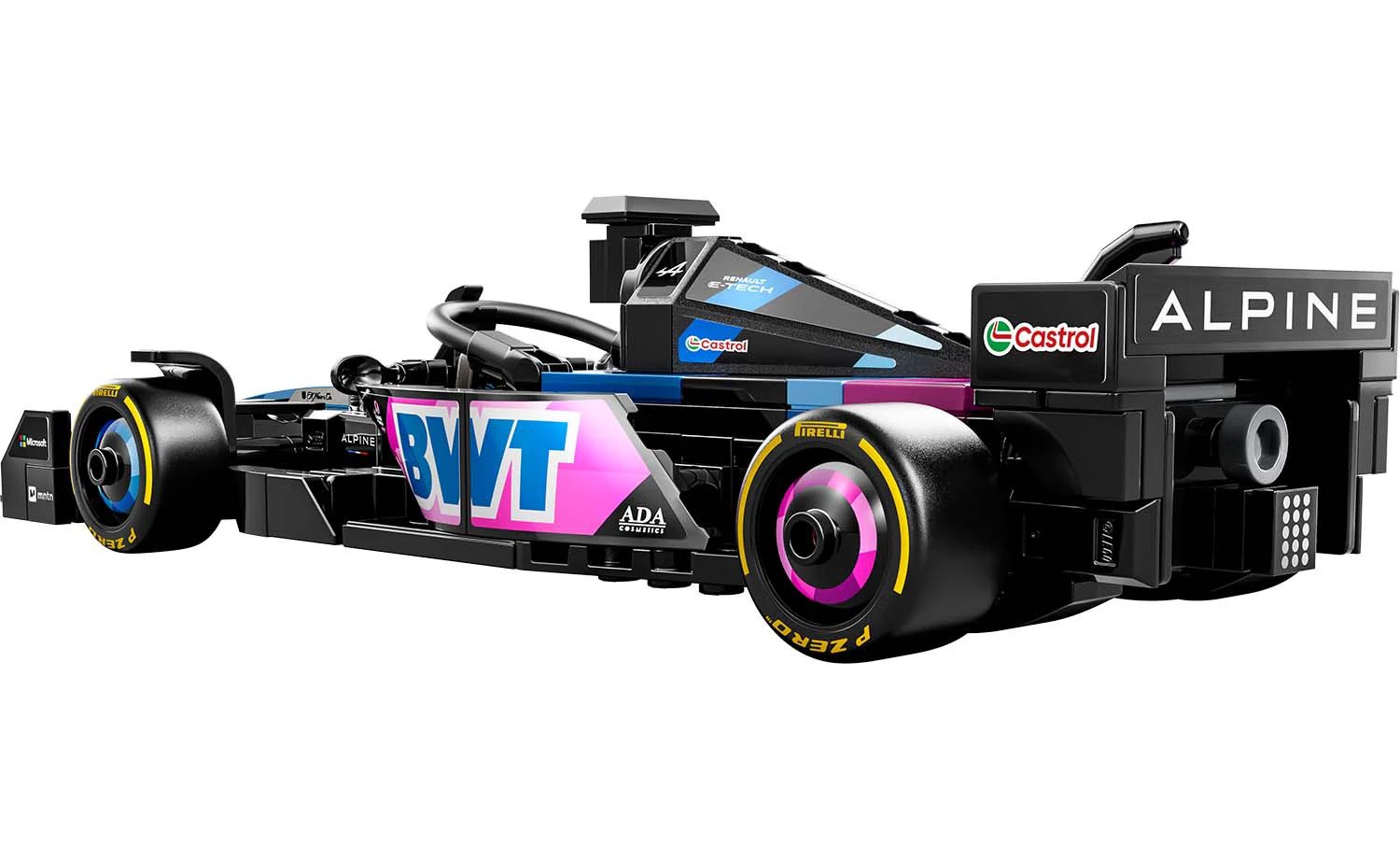 The F1 model car features a cockpit that opens by lifting the halo bar, a rear wing, wishbone suspension, sponsor stickers and wider rear tires imprinted with “Pirelli.” The race car toy also includes a driver minifigure wearing an Alpine outfit and a winged helmet to place inside the cockpit.