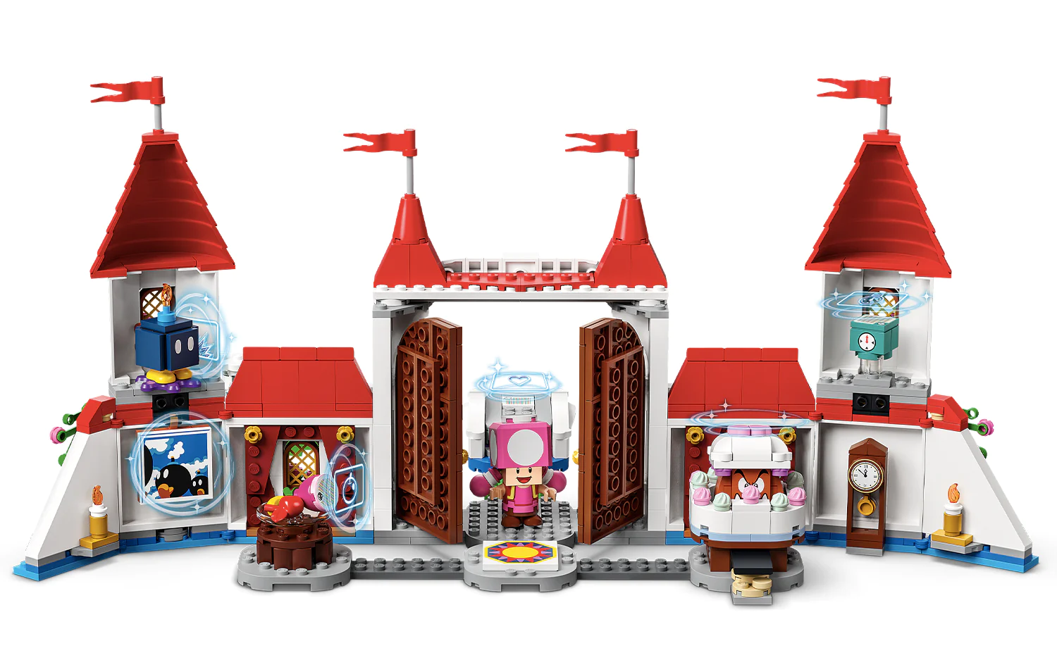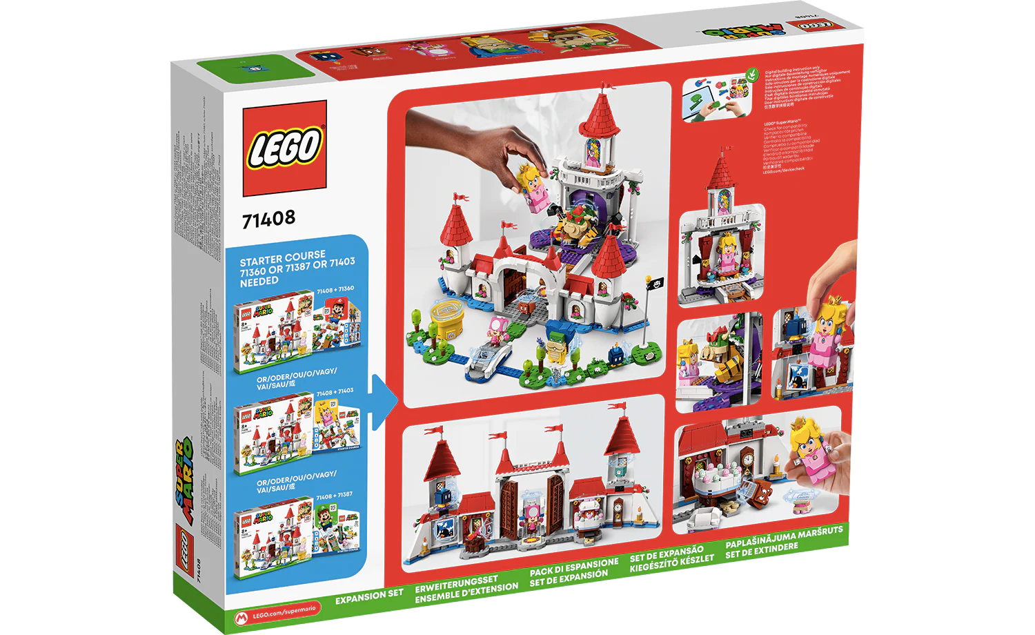 There is so much for players to explore and many ways to earn digital coins with their interactive LEGO® Mario™, LEGO® Luigi™ or LEGO® Peach™ figures (not included). It features a throne room with a spinning wall to reveal Bowser, Peach stained-glass window, a Bob-omb painting with an Action Tag, cake with a Goomba hiding inside, Special Pipe: Peach’s Castle, Time Block, ‘broken’ bridge, fruit bowl with a purple fruit and more. (Note: the 71360, 71387 or 71403 Starter Course is required for interactive play.)