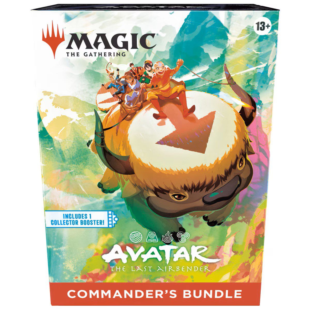 Magic: The Gathering® | Avatar: The Last Airbender™ Commander’s Bundle Release Date: Nov 21, 2025 Team Avatar is back! The action, adventure, and spirit of Avatar: The Last Airbender awaken in Magic: The Gathering. Master new mechanics Earthbending, Airbendending, Waterbending and Firebending to tell your version of the story and discover your Magic playstyle. Bend the elements. Master the game. This masterful bundle unites all the greatest elements for Avatar: The Last Airbender fans, boasting nine Play Boosters, gorgeous full-art basic lands, and a Collector Booster packed with rares and/or mythic rares, foils, and other stylish surprises. But that’s not all—Commander players will find Avatar-themed staples Sol Ring, Swiftfoot Boots, and Arcane Signet, plus two classic spells from a selected list of ten that are perfect for any commander’s arsenal. ©2025 Viacom International Inc. TM & ©2025 Wizards Contents: • 2 of 10 Magic: The Gathering | Avatar: The Last Airbender Commander’s Bundle Booster Fun cards • 9 Magic: The Gathering | Avatar: The Last Airbender Play Boosters • 1 Magic: The Gathering | Avatar: The Last Airbender Collector Booster • Special Magic: The Gathering | Avatar: The Last Airbender versions of Sol Ring, Arcane Signet, and Swiftfoot Boots • 5 traditional foil Avatar’s Journey lands • 5 full-art Avatar’s Journey lands • 10 traditional foil basic lands • 10 non-foil basic lands • 1 Magic: The Gathering | Avatar: The Last Airbender Click-wheel • 1 card box