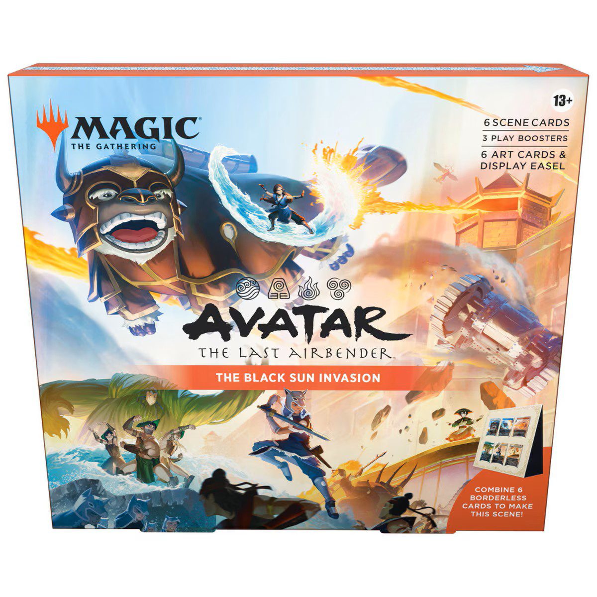 Magic: The Gathering® | Avatar: The Last Airbender™ Scene Boxes Release Date: Nov 21, 2025 Team Avatar is back! The action, adventure, and spirit of Avatar: The Last Airbender awaken in Magic: The Gathering. Master new mechanics Earthbending, Airbendending, Waterbending and Firebending to tell your version of the story and discover your Magic playstyle. Bend the elements. Master the game. Immortalize iconic moments with Magic: The Gathering | Avatar: The Last Airbender Scene Boxes. Power up your deck or collection with six borderless scene cards and piece them together to reveal the full story. The Black Sun Invasion Scene Box Team Avatar leads the invasion of the Fire Nation during the solar eclipse. Are they walking into a deadly trap? Tea Time at the Jasmine Dragon Old friends reunite for a cup of jasmine tea at Uncle Iroh’s shop. Can friendships last more than one lifetime? ©2025 Viacom International Inc. TM & ©2025 Wizards Contents: • 3 Magic: The Gathering | Avatar: The Last Airbender Play Boosters • 6 traditional foil scene cards • 6 art-only scene cards • 1 display easel