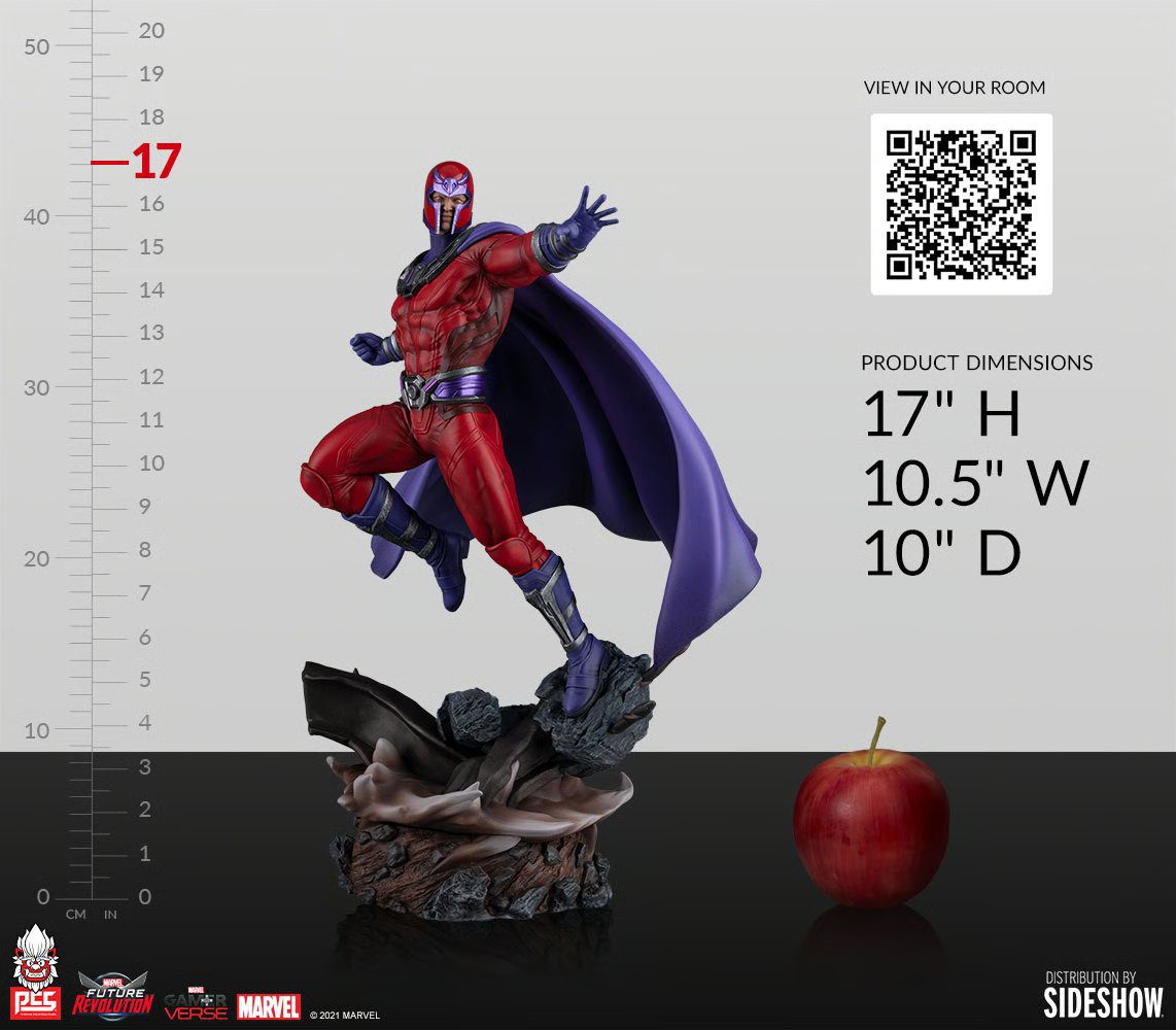 “We must prepare to take what evolution has promised us.” Sideshow and Premium Collectibles Studio present the Magneto 1:6 Scale Diorama. Inspired by the mutant mastermind’s appearance in the open-world action RPG MARVEL Future Revolution, the Magneto 1:6 Scale Diorama measures 17” tall and 10.5″ wide on a base detailed with rubble, rebar, and other elements that bow to the will of the Master of Magnetism and his incredible power. As if held aloft by the magnetic fields he generates, Magneto leaps into action in order to secure the future of mutantkind. The Magneto 1:6 Scale Diorama is fully sculpted to capture the might of this iconic mutant, based on his in-game model. His signature red and purple costume features varied textures and piping as well as silver accents underscoring his powerful physique. Magneto’s portrait has white eyes that emphasize his abilities in action, and he wears his glossy red helmet to withstand any psychic influence from his enemies. As he wields his magnetic abilities, his sculpted purple cape flows dramatically behind him, giving a sense of action and movement to this dynamic X-Men statue. You cannot resist the pull of the Magneto 1:6 Scale Diorama by PCS — add him to your Marvel collection today! Product Size Height: 17″ (43 cm) Width: 10.5″ (27 cm) Depth: 10″ (25 cm) * Box Size Height: 16.00″ (41 cm) Width: 21.25″ (54 cm) Depth: 28.50″ (72 cm) * Shipping Weight 16.50 lbs (7.5 kg) * * Size and weight are approx. values