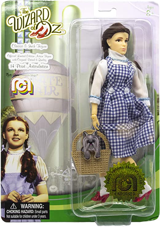 Dorothy lands in the magical place known as Oz after a tornado spirits her from her home in Kansas. In her search for a way to return home, Dorothy befriends others looking to meet the reclusive Wizard to help them with their troubles. This Mego is wearing her iconic ruby slippers, plaid dress, styled pigtails, and, of course, carrying a basket with Toto.