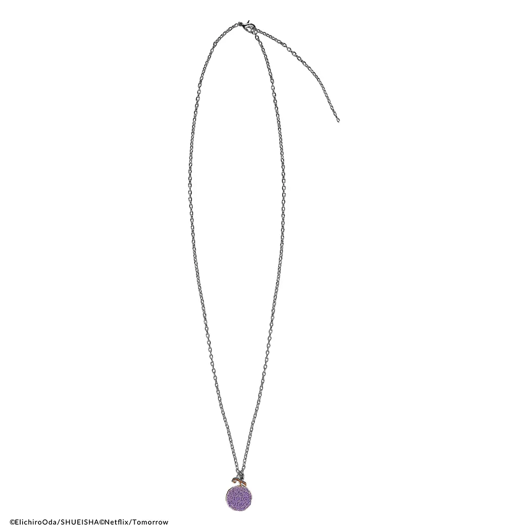 A tribute to the iconic series and symbol of limitless potential, this necklace boasts a sleek sliver chain with a Gum-Gum Fruit pendant hanging as the centre piece. The pendant, adorned in a beautiful lilac hue and patterned with intricate swirls, brilliantly captures the essence of the fruit as seen in the show.