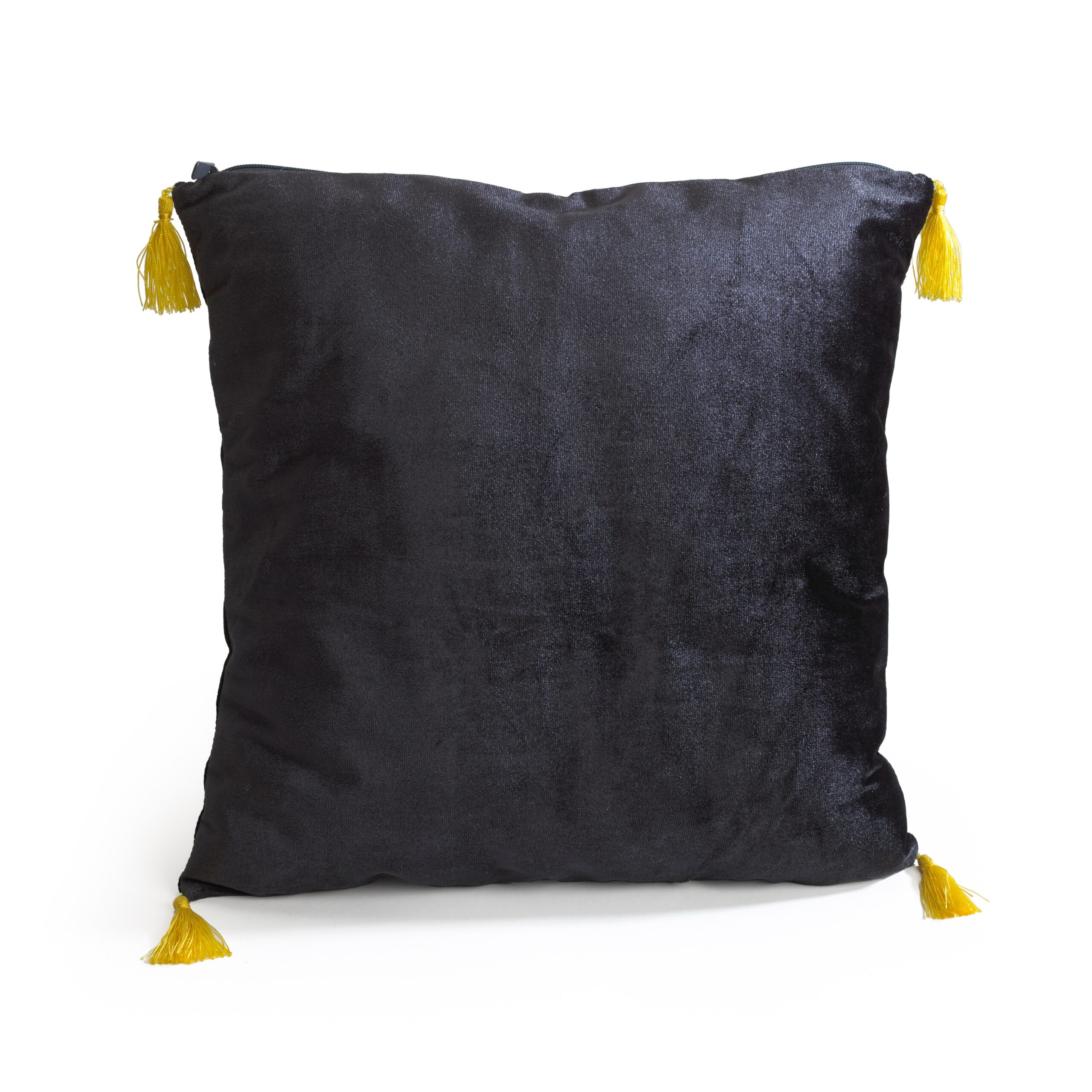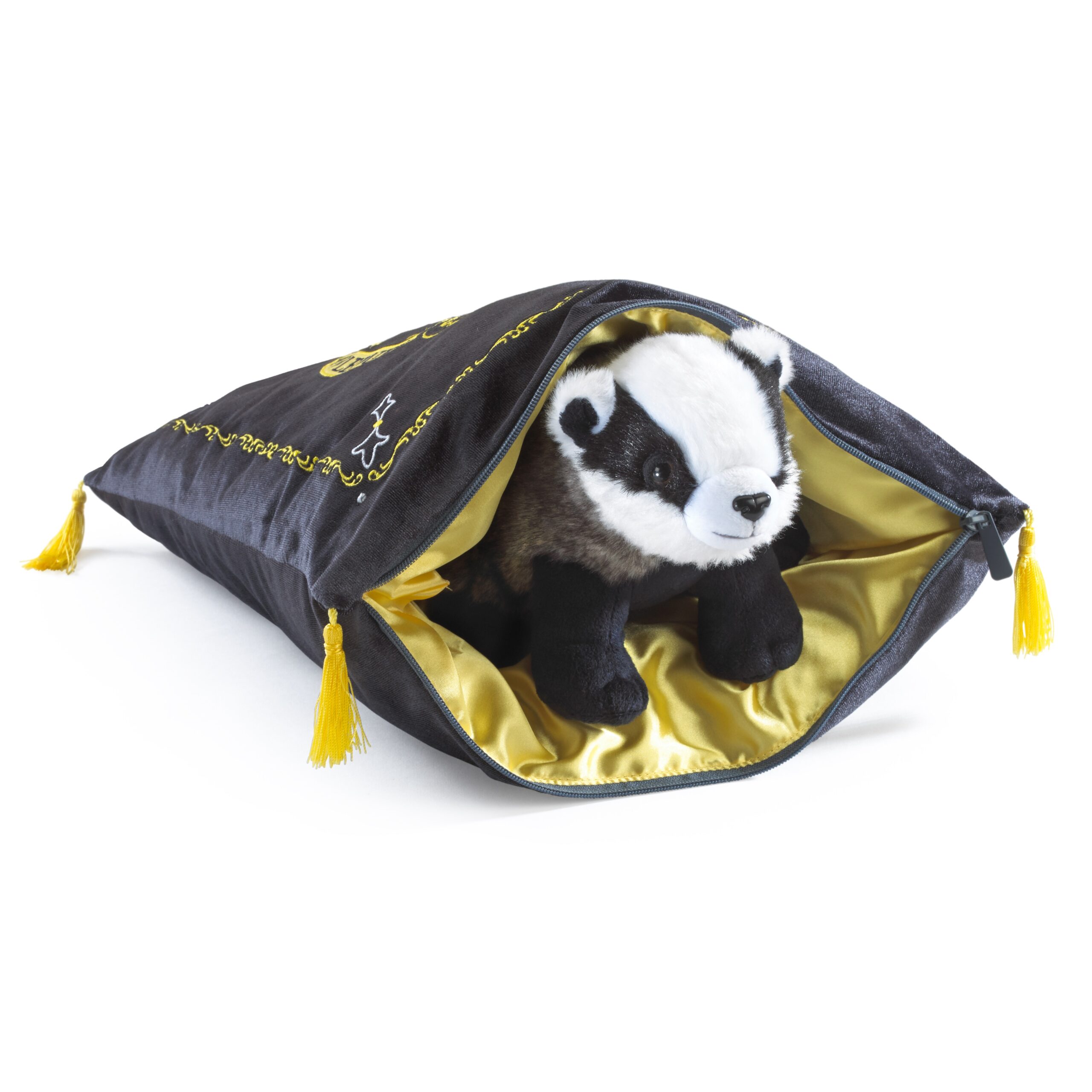 An embroidered velvet Hufflepuff house crest cushion, containing a removable plush of the Hufflepuff badger mascot as featured in the Harry Potter films.
