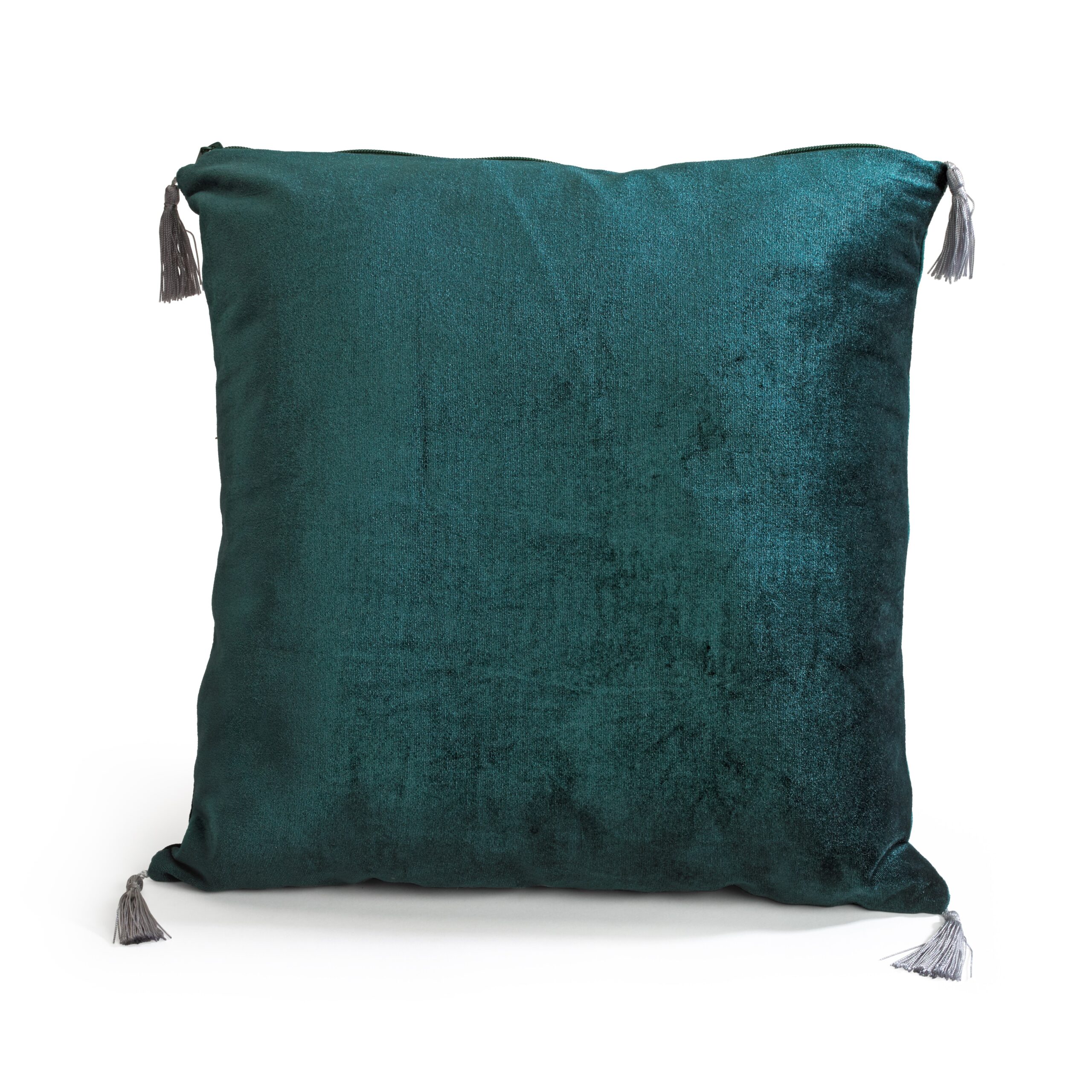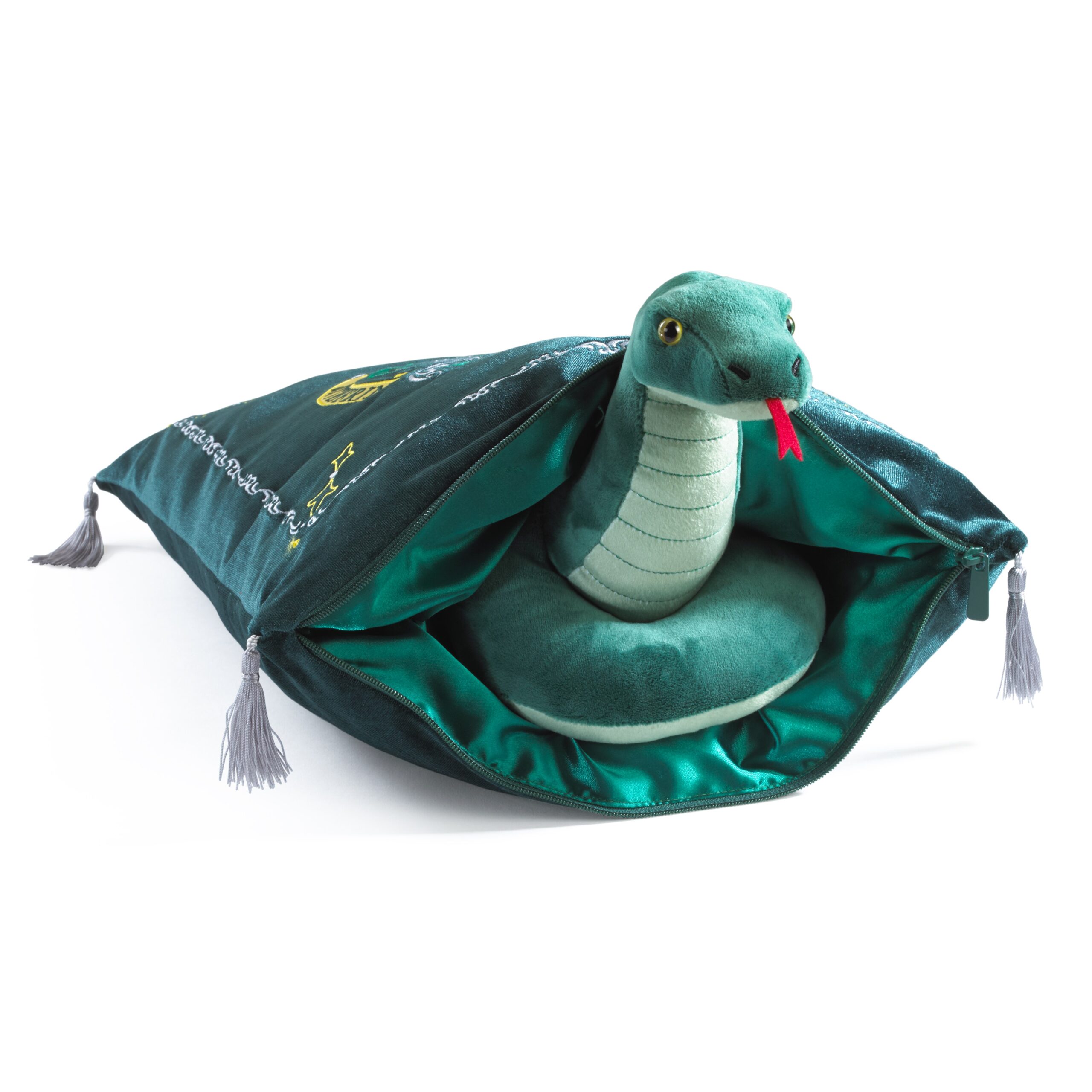 An embroidered velvet Slytherin house crest cushion, containing a removable plush of the Slytherin snake mascot as featured in the Harry Potter films.
