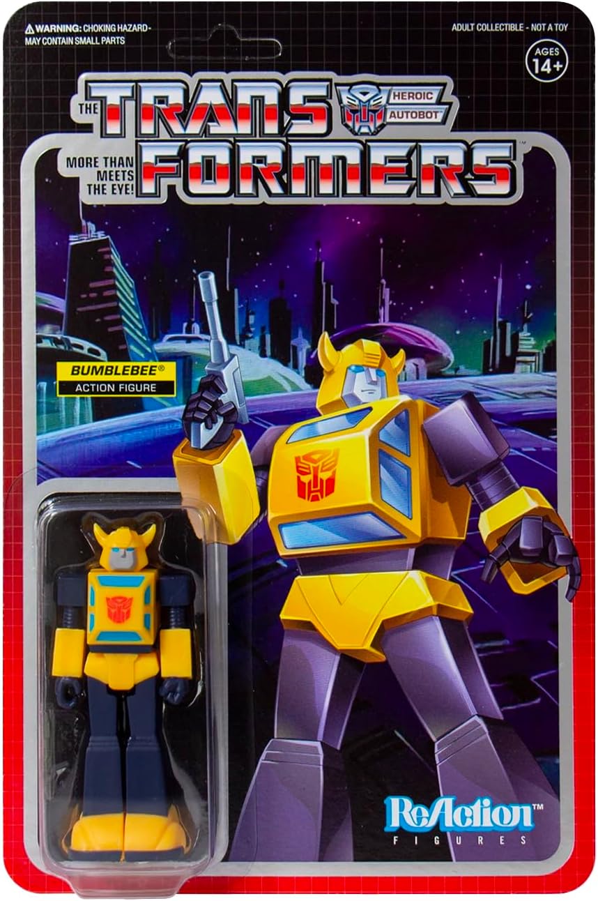 “Robots in disguise!” The Super7 x Transformers collaboration expands as the Autobots and Decepticons join the 3.75-inch ReAction Figure world! Bumblebee, the small but mighty Autobot, comes with blaster accessory. Packaged on a card back featuring brand new retro-style art.