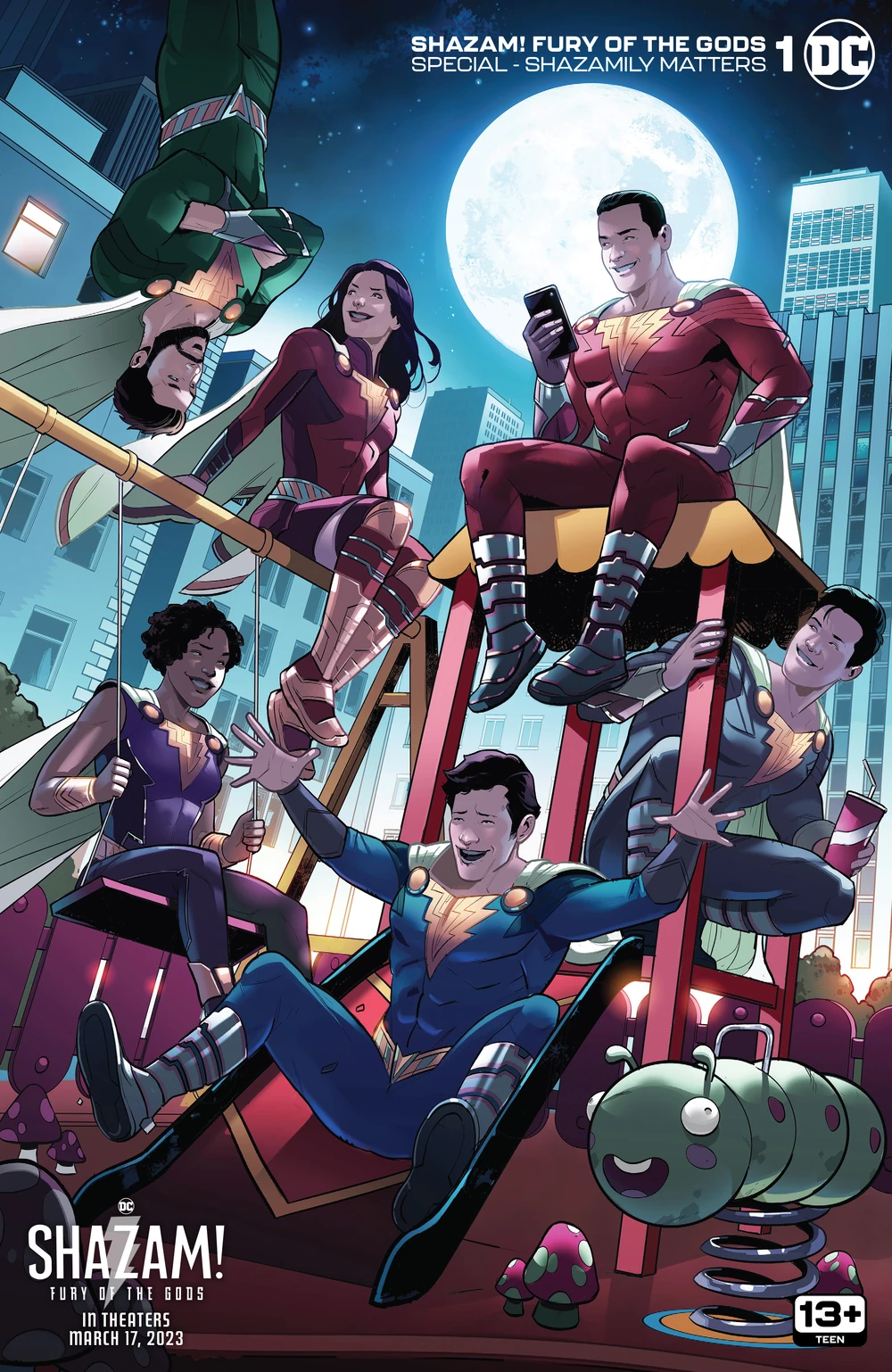 This 96-page giant features stories starring all of your favorite Shazam! characters as written by the actors who play them! Actor Zachary Levi takes the reins on writing Shazam, and Adam Brody, Ross Butler, D.J. Cotrona, Grace Caroline Currey, and Faithe Herman wield the mighty pen for their Shazamily superheroes! Battle zombies, befriend dinosaurs, try to get a phone signal in a world of barbarians, explore glitter land, and more just in time for the release of the brand-new feature film Shazam! Fury of the Gods! Made with all the love and fun of a superhuman family cookout!