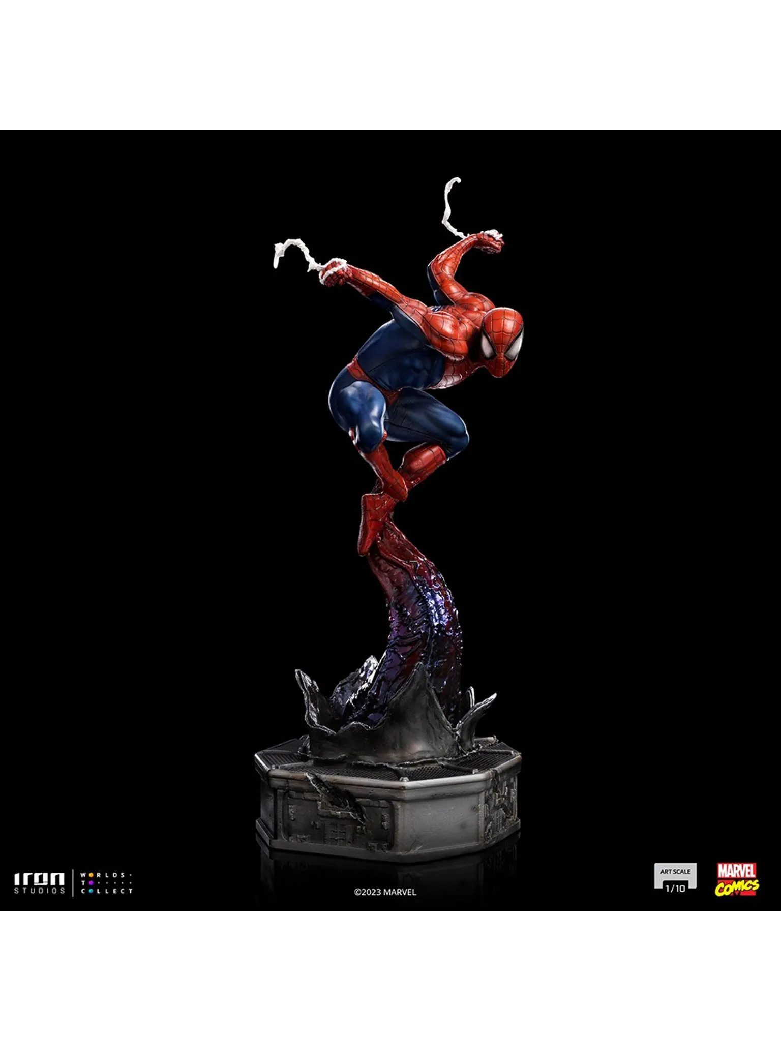 Flexing his mighty muscles, the legendary friendly neighborhood superhero uses the maximum of his arachnid strength and dexterity to dodge and stay away from the attack of one of his most terrifying and powerful enemies, with a set base in which a monstrous and viscous alien tongue breaks the structure of a metallic base floor underneath his feet to try to capture him, the fearless wall climber superhero leans resolute on his webs facing the powerful and lethal creature. Inspired by his bold look in the comic books from the 1990s, Iron Studios present the statue “Spider-Man – Spider-Man vs Villains – Art Scale 1/10”, introducing the always epic clash between the amazing Spider-Man and the alien Symbiote Venom, in which the set can be complete with the statue “Venom – Spider-Man vs Villains – Art Scale 1/10”, with the sinister villain in another exclusive version by Iron Studios.