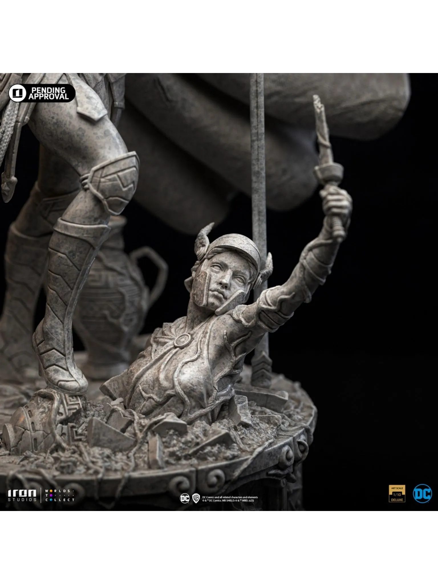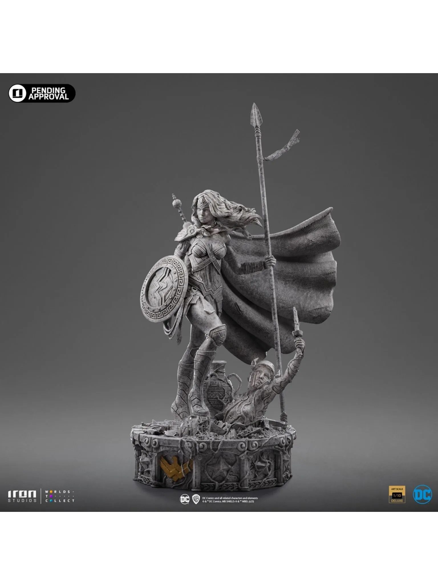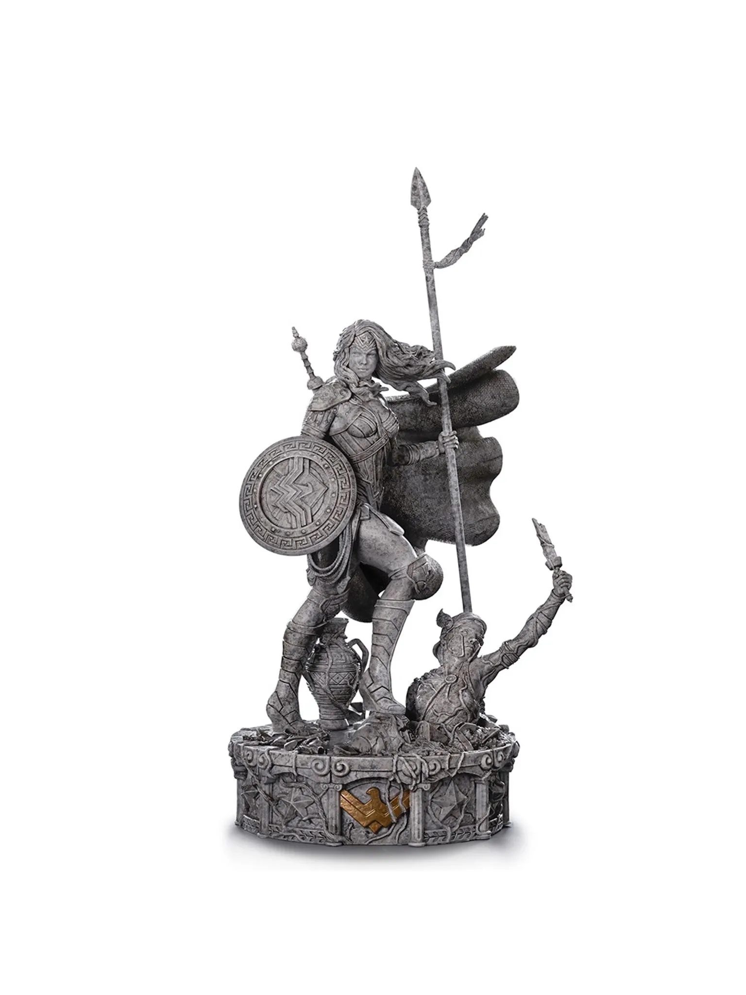 Amid roots and tendrils of ground vegetation embracing ancient broken vases and urns, next to the remains of a fallen statue of Hermes, the Greek god of speed, in a set of an ancient temple in ruins related to the mythical Mount Olympus, the majestic figure of a warrior goddess stands out in the form of a marble-toned statue wielding a long spear in her left hand and protecting her right arm with a powerful shield decorated with her symbol. With a long cape and armed with a sword on her back and the mystical Lasso of Hestia on her waist, on a base decorated with Greek columns all around with her symbolic star sculpted between them and her logo on the front, Iron Studios proudly presents the variant statue “Wonder Woman Unleashed (Marble Color Variant) – DC Comics – Art Scale 1/10”, featuring the greatest superhero of the DC universe in an extremely detailed sculpture, on a base full of mythological elements that refer to ancient Greece, following the standard of excellence and luxury in the 1/10 scale of Iron Studios’ Unleashed line.