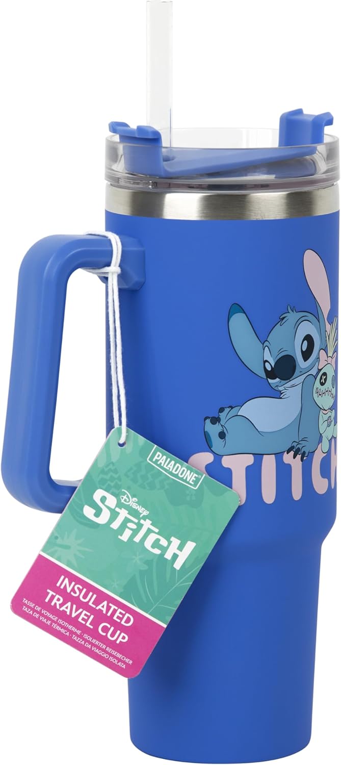 Stay hydrated all day long with this Disney Stitch Travel Cup. The 900ml (30 fl oz) blue insulated soft-touch tumbler will keep your drink cold or hot for hours. Its versatile multi-way lid has three convenient positions: a sealed straw opening, an easy-sip option, and a cover top for when you’re on the move. The practical comfort-grip handle makes for effortless carrying, and the narrow base is designed to fit snugly in car cup holders. Not suitable for dishwasher or microwave use. Keep the Stitch Travel Mug always by your side for sipping throughout the day. Versatile multi-way lid 900ml (30 fl oz) travel tumbler with handle and straw Narrow base for car cup holders Officially licensed Disney product