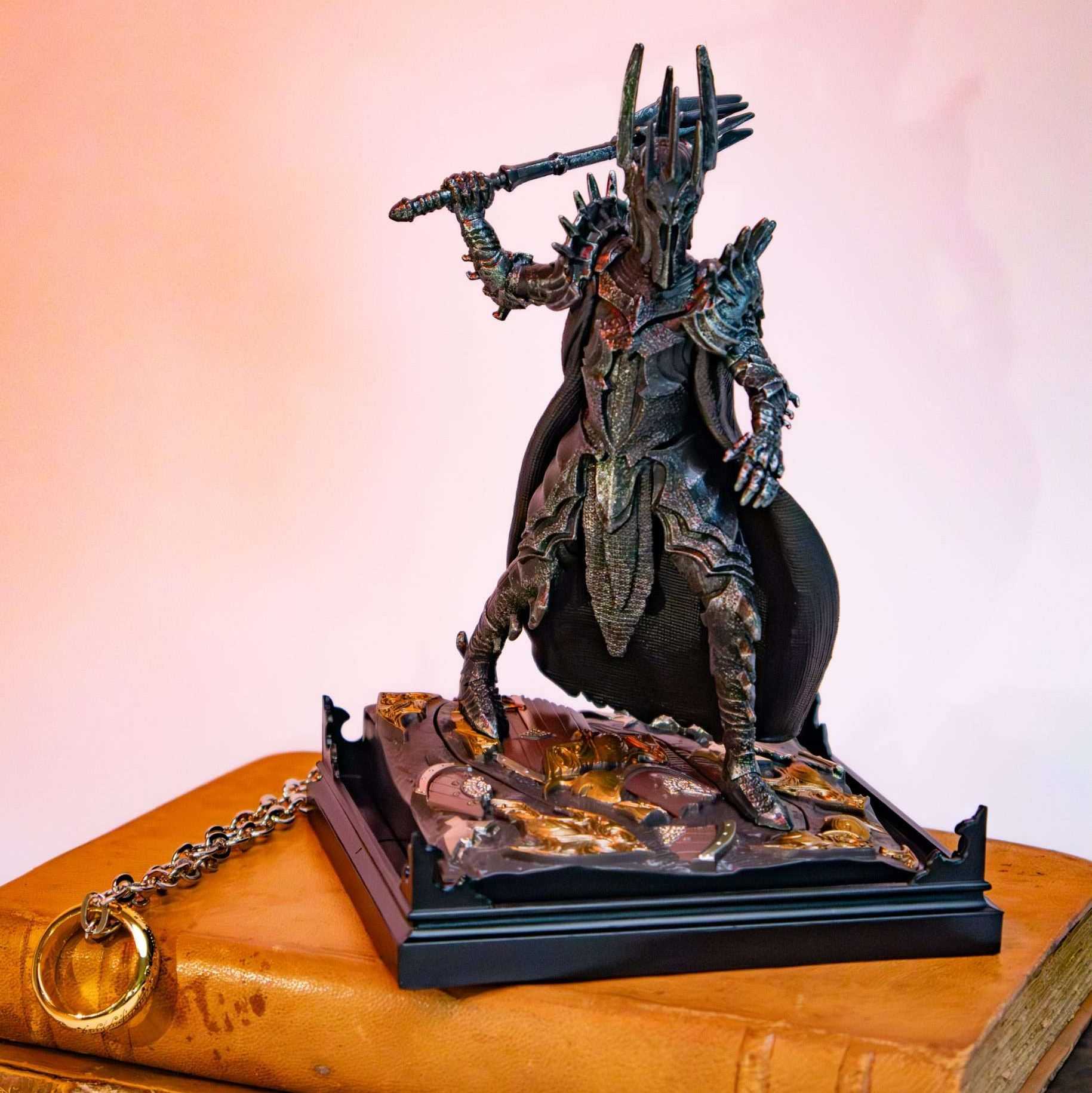 A finely crafted, intricately painted sculpture of the dark lord Sauron, the eponymous Lord of the Rings.