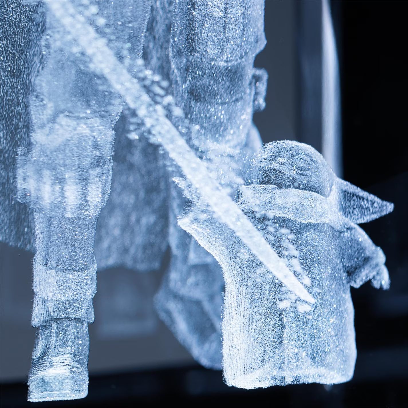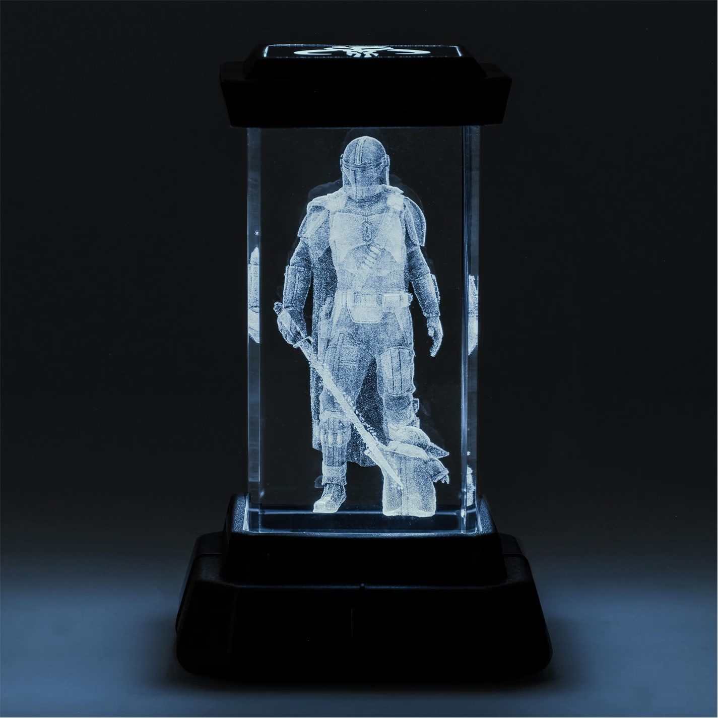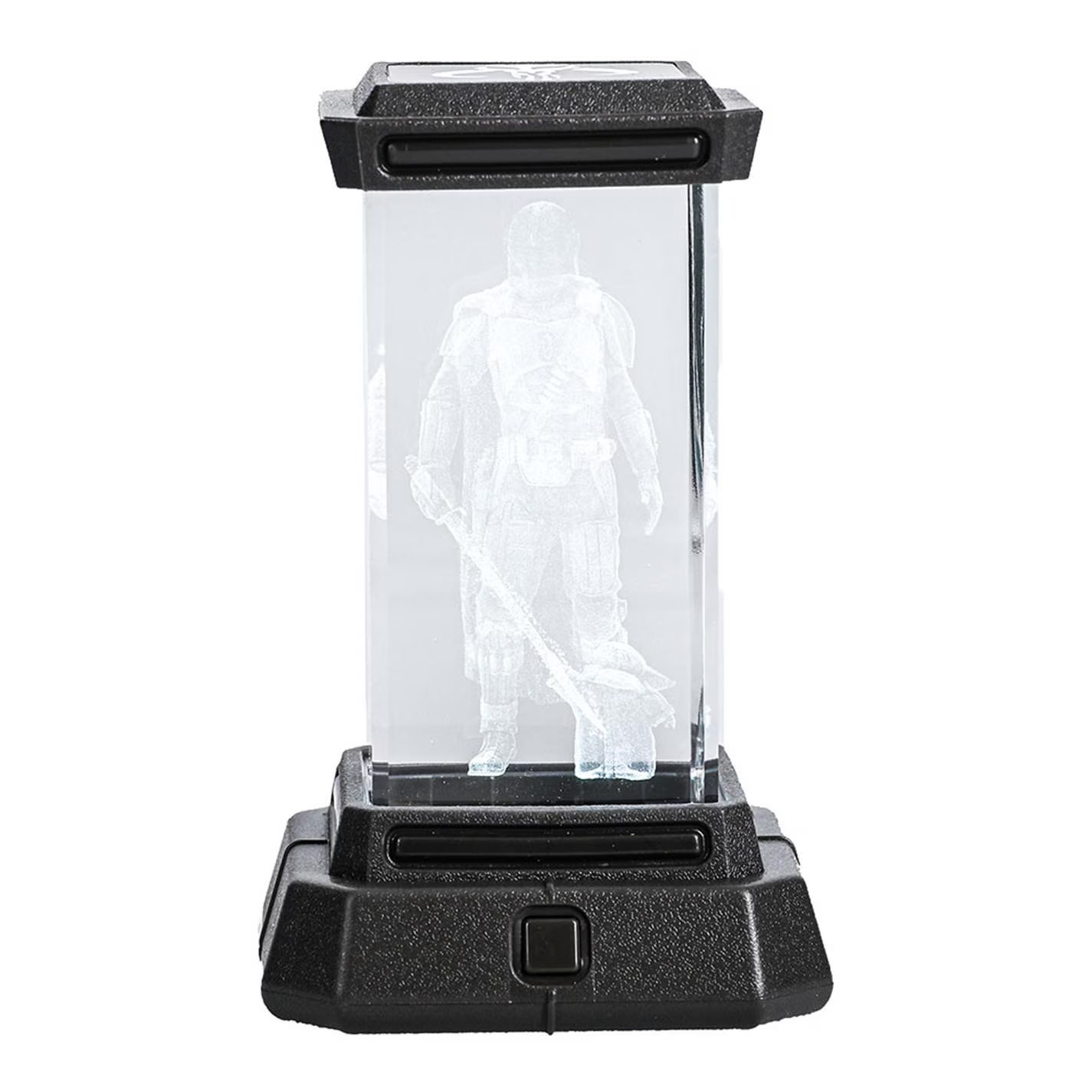 The 12cm (4.7â€) tall light contains a 3D laser etched crystal model of The Mandalorian and Grogu. Clad in armour, Din Djarin is posed with the darksaber. The light has three lighting modes – choose between blue or white, or let the light phase between the two.